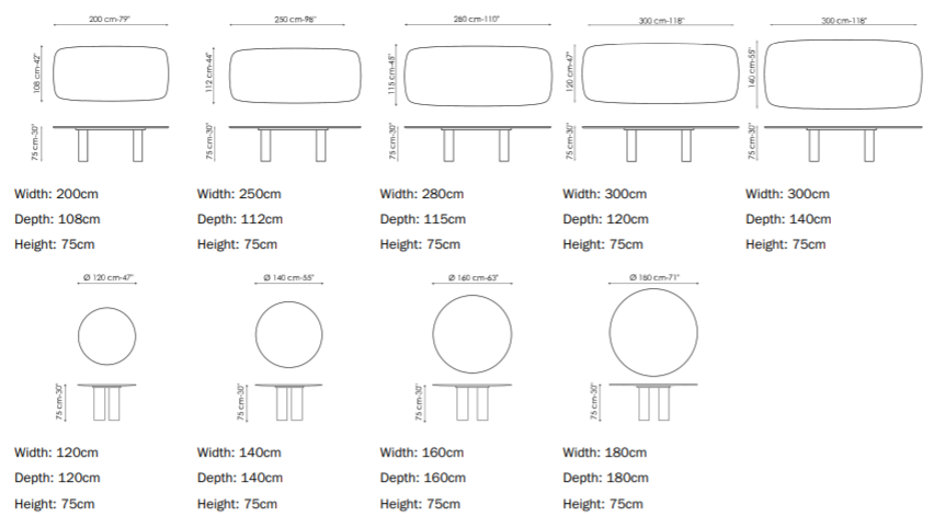 Its concept is based on chameleon-like silhouettes, starting with the base: its four legs with drop-shaped feet appear either thick or sharp and thin, playing together to offer a different perception of their visual weight as you walk around the table, with an impressive scenic yet slender and graceful presence, given by its rounded shapes.