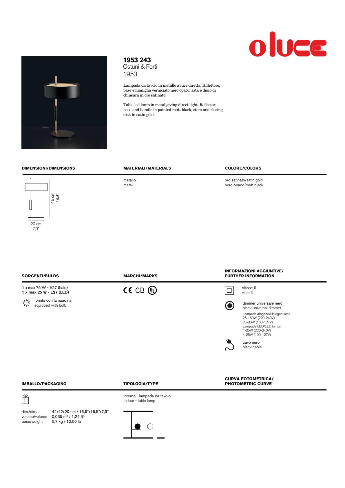 Το φωτιστικό 1953, σχεδιασμένο από τους Ostuni και Forti, διατίθεται σε δύο εκδόσεις – επιδαπέδιο και επιτραπέζιο – οι οποίες διαφοροποιούνται στις αναλογίες και το μέγεθος, αλλά μοιράζονται την ίδια σχεδιαστική ταυτότητα. Ο σχεδιασμός του χαρακτηρίζεται από τη μετατόπιση ολόκληρης της κεφαλής του φωτιστικού από το κέντρο προς το πλάι, στοιχείο που του προσδίδει μοναδική αισθητική ισορροπία.