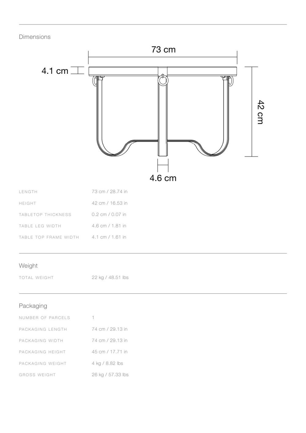 Τοποθετημένο σε τρία μαλακά καμπυλωτά μεταλλικά πόδια, που συναντιούνται κομψά στην καρδιά του τραπεζιού, το στρογγυλό γυάλινο καπάκι περιβάλλεται από χειροποίητο δερμάτινο χείλος και κοσμείται με τρεις επιχρυσωμένους ορειχάλκινους κρίκους.