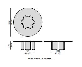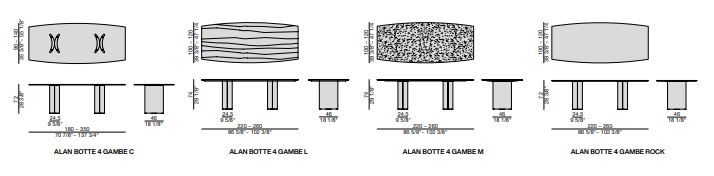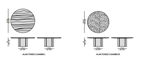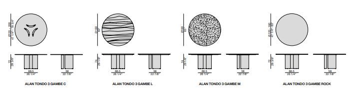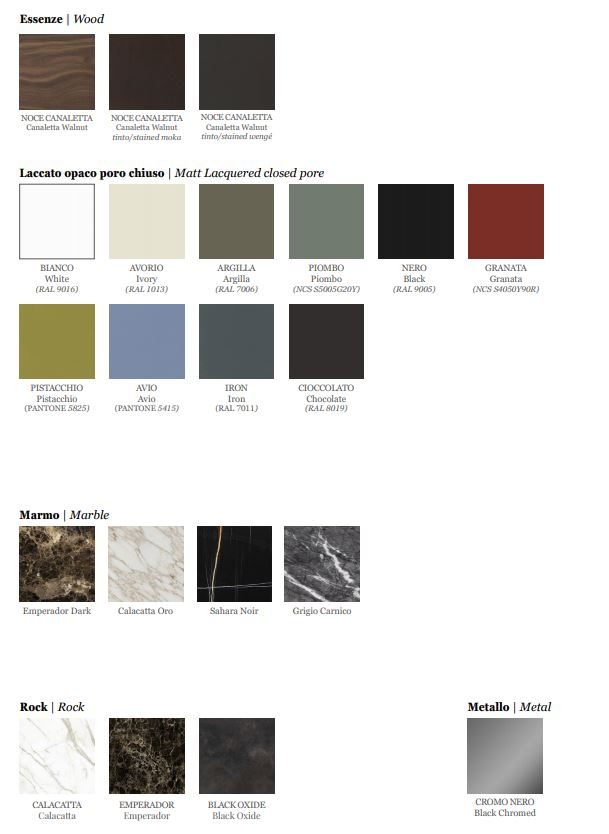 Τραπέζι φαγητού, της εταιρείας Porada, με βάση σε σχήμα μισοφέγγαρο από ξύλο καρυδιάς Canaletta και επιφάνεια, διαφανές γυαλί (πάχος 15 mm), σε ξύλο (πάχος 40 mm), σε μάρμαρο (πάχος 20 mm) ή σε Rock (πάχος 6 mm). Μεταλλικό ποδαράκι σε μαύρο χρώμα.