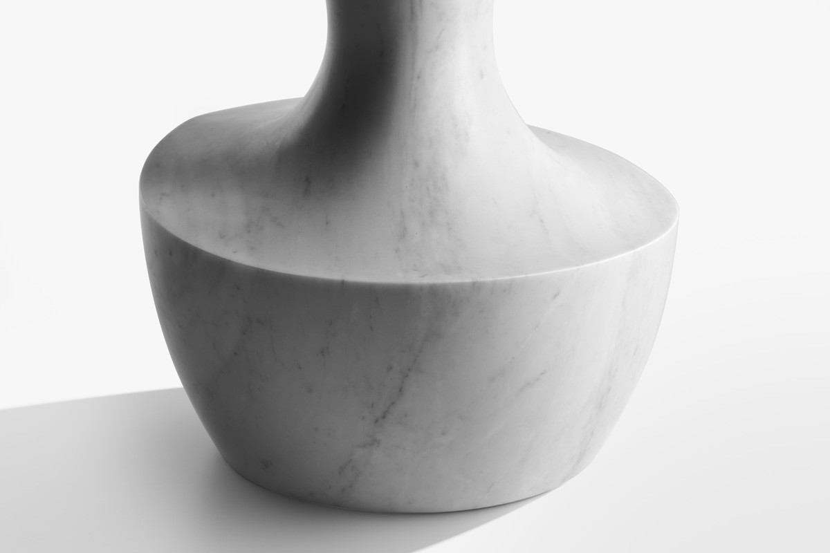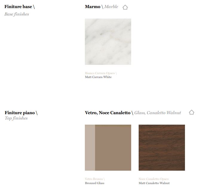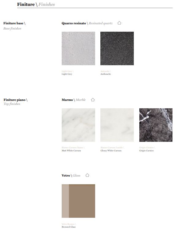 Η βάση επαναπροτείνεται σε ρητινοποιημένο χαλαζία στα φινιρίσματα Anthracite και Light Grey, ενώ η κορυφή προτείνεται στο νέο μαρμάρινο φινίρισμα Grigio Carnico, κομψό και με λεπτές φλέβες.