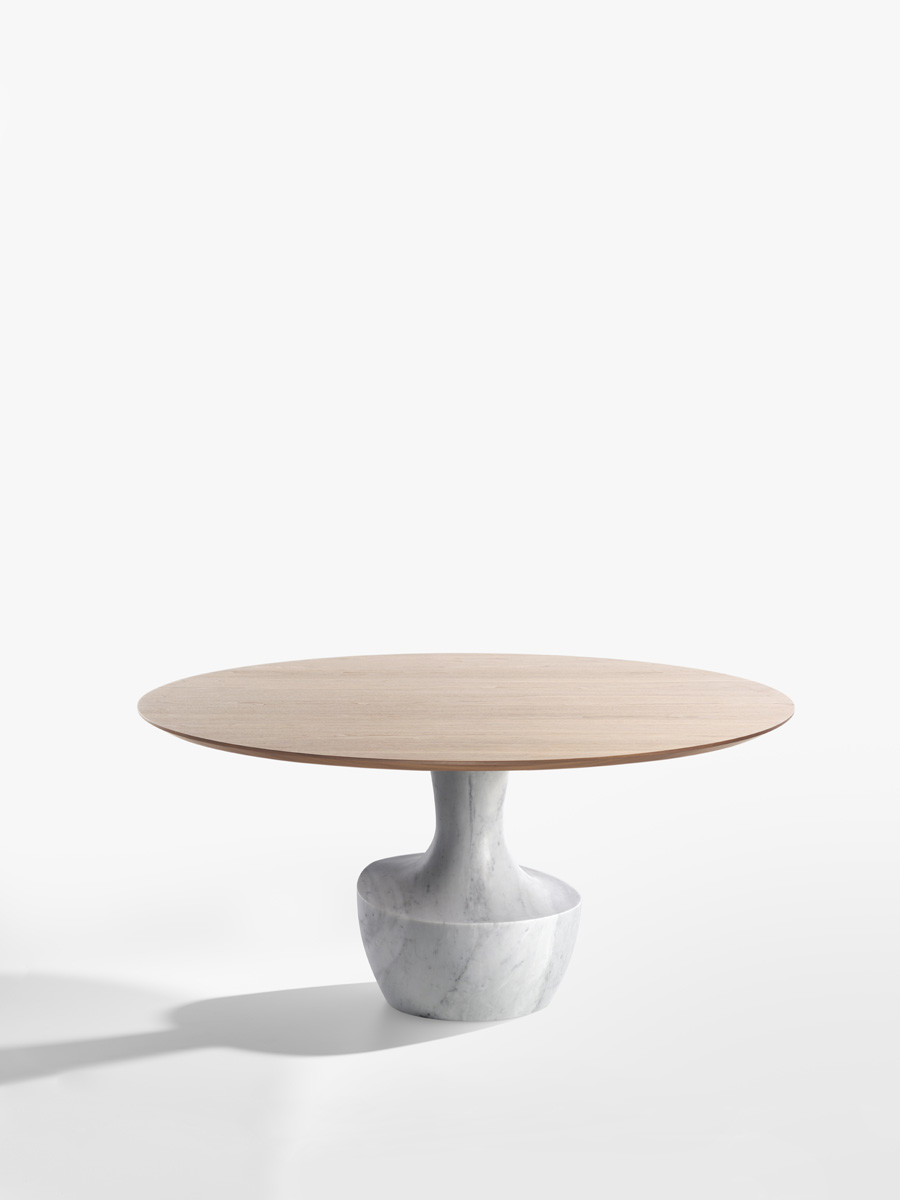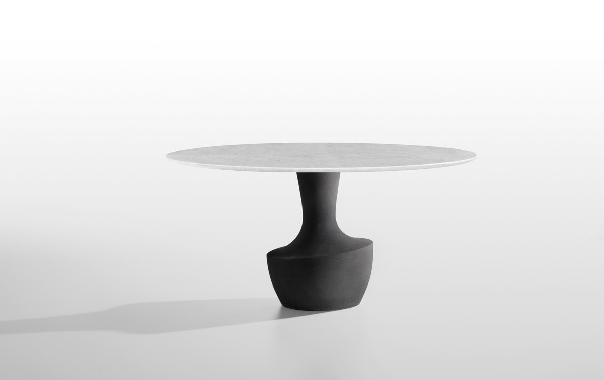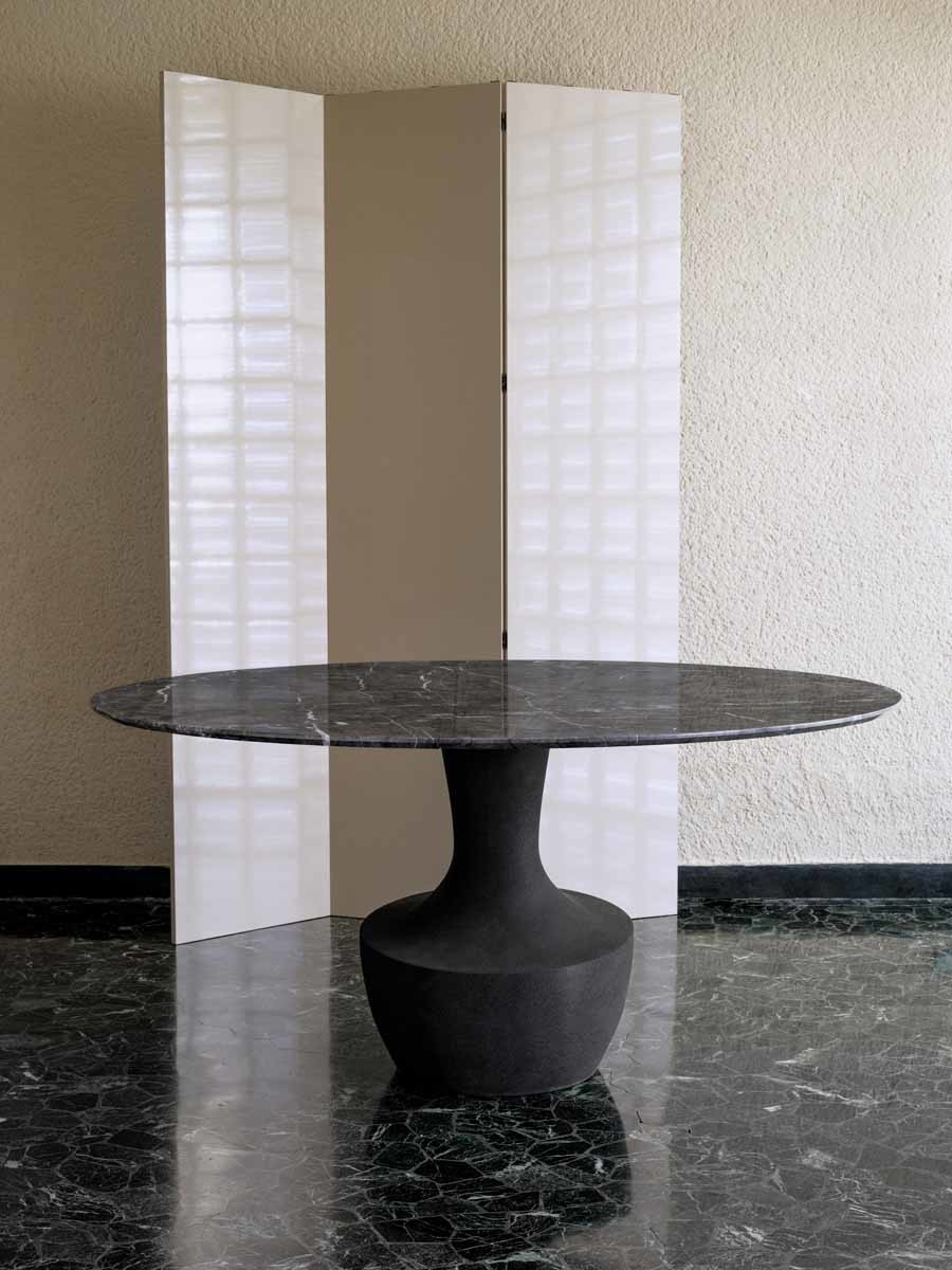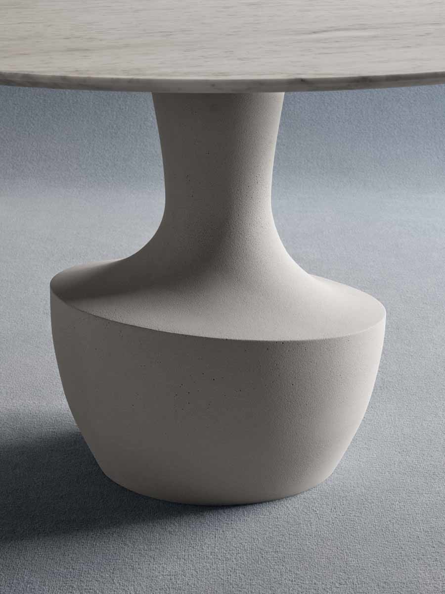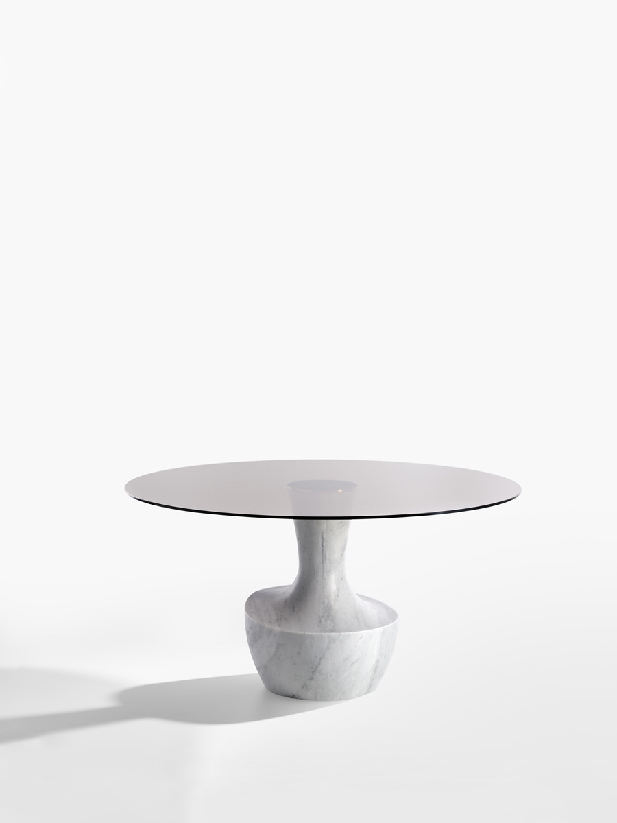 Το Anfora είναι ένα στρογγυλό τραπέζι σε δύο μεγέθη, με μαρμάρινη βάση διαθέσιμη στα φινιρίσματα της συλλογής, σε συνδυασμό με ένα λεπτό μπρονζέ γυαλί ή από καρυδιά Canaletto.