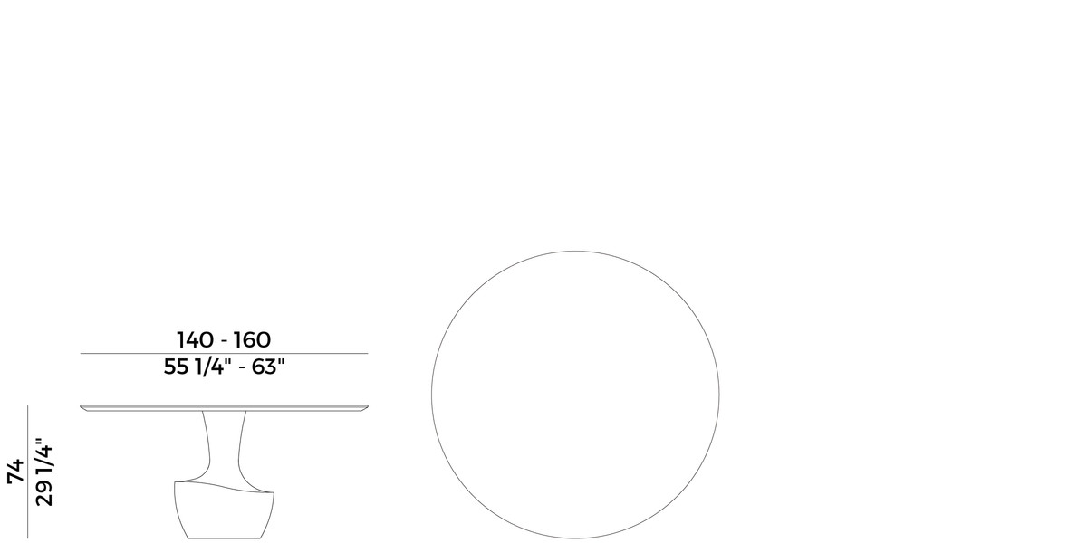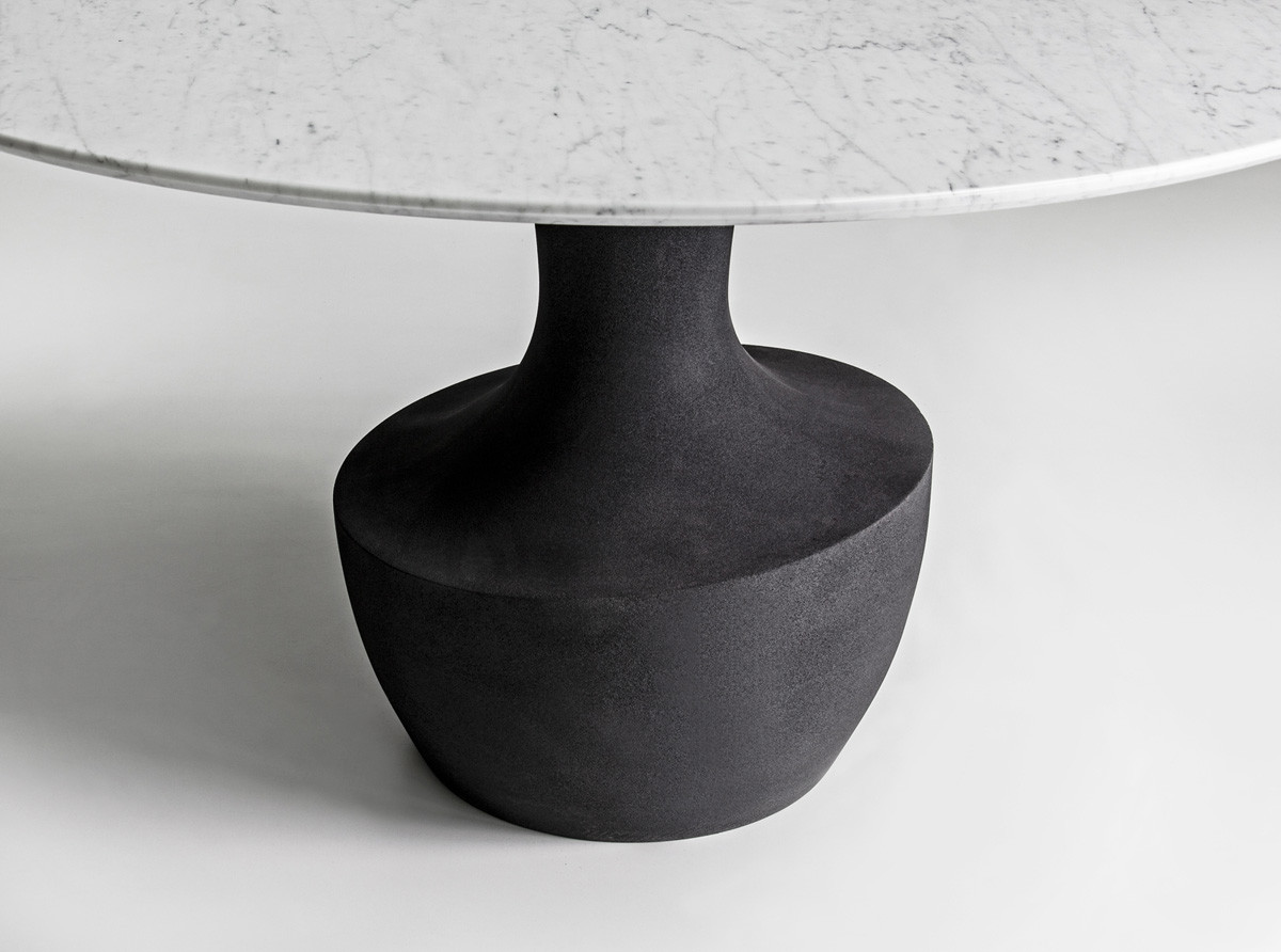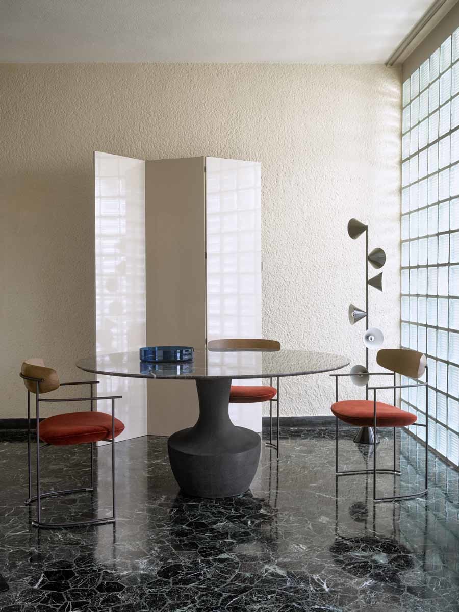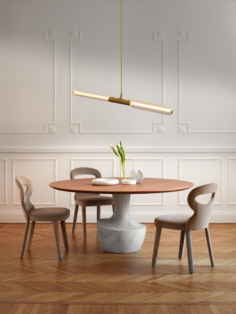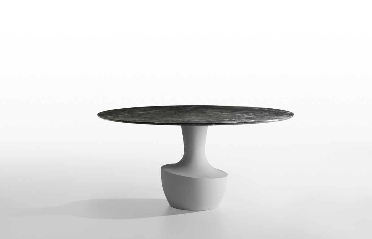 Το Anfora είναι ένα στρογγυλό τραπέζι σε δύο μεγέθη, με μαρμάρινη βάση διαθέσιμη στα φινιρίσματα της συλλογής, σε συνδυασμό με ένα λεπτό μπρονζέ γυαλί ή από καρυδιά Canaletto.