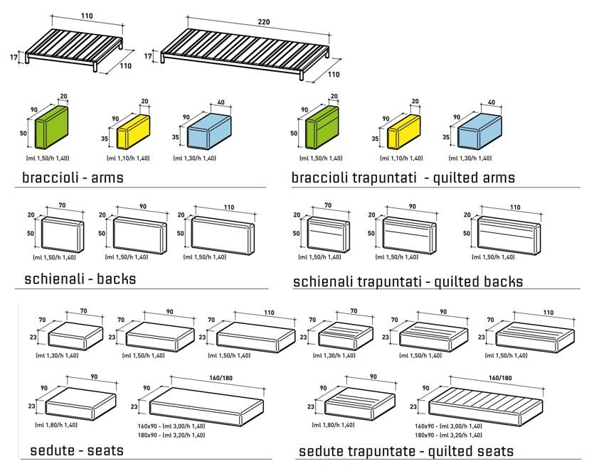 Επικαλυμμένα στοιχεία διαθέσιμα στην ομαλή ή καπιτονέ έκδοση σε διαφορετικά μεγέθη.