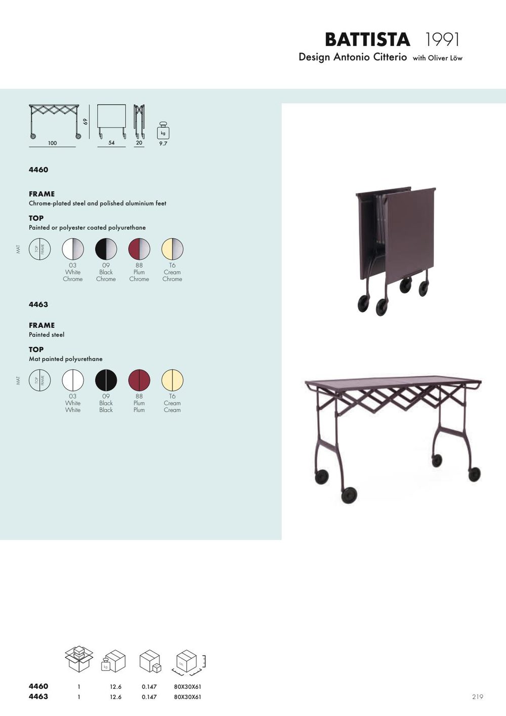 Το Battista, πέρα από το ότι είναι ένα πρακτικό τρόλεϊ, που χαρακτηρίζεται από τον επιτυχή συνδυασμό ανάμεσα σε πλαστικά και μεταλλικά υλικά, προτείνεται και ως κανονικό τραπέζι που επιμηκύνεται και πτύσσεται ιδανικό για μπουφέ και απεριτίφ και ως μικρό τραπέζι μόνο του.
