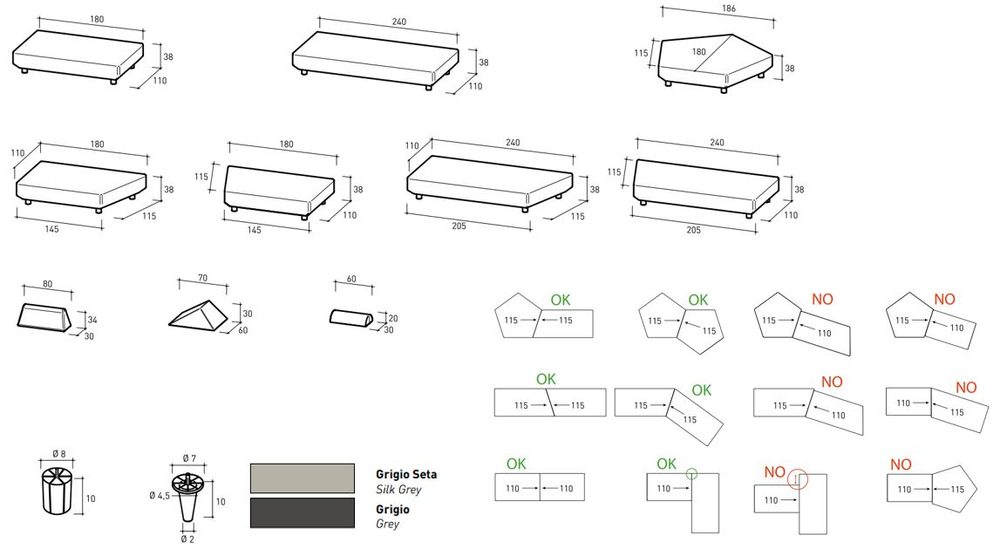 Ταπετσαρία διατίθεται σε διάφορες κατηγορίες υφασμάτων εξωτερικού χώρου Varaschin. Τα πόδια διατίθενται σε δύο εκδόσεις, Botero και Slim, σε χρώματα μεταξιού γκρι και γκρι.