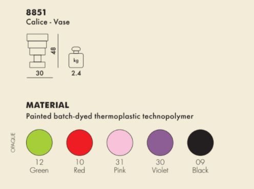 Το βάζο Calice ανήκει στη συλλογή 'Kartell goes Sottsass - A Tribute to Memphis' που κυκλοφόρησε το 2015 προς τιμήν του Ettore Sottsass. Είναι κατασκευασμένο απο μαζικά χρωματισμένο θερμοπλαστικό και υπάρχει σε πέντε ματ αποχρώσεις ( κόκκινο , μωβ ,λιλά , πράσινο και μαύρο )