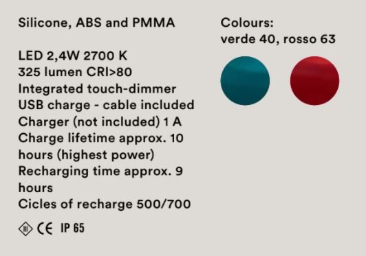 Η φορητή λυχνία LED Cri Cri είναι ένα παιχνιδιάρικο, ιδιότροπο φως που κατασκευάζεται τόσο για εσωτερική όσο και για εξωτερική χρήση. Η λάμπα διαθέτει ενσωματωμένη πηγή φωτός και μπαταρία LED, η οποία σας επιτρέπει να επαναφορτίζετε χρησιμοποιώντας φορτιστή USB για να έχετε μέγιστη διάρκεια ζωής 10 ωρών όταν βρίσκεστε στην υψηλότερη ισχύ. Μπορείτε να μεταφέρετε το φως οπουδήποτε θέλετε, είτε πεζοπορία μέσα στο δάσος, για χρήση στον δικό σας κήπο ή κατά τη διάρκεια κάμπινγκ κάτω από τα αστέρια. Η επαναφορτιζόμενη λυχνία LED Cri Cri διαθέτει ρυθμιστή αφής, ώστε να μπορείτε να δημιουργήσετε την ατμόσφαιρα που χρειάζεστε, είτε σε εσωτερικούς χώρους είτε έξω. Η φορητή λάμπα διατίθεται σε 2 χρώματα, πράσινο ή κόκκινο και είναι ένα πολύ ευέλικτο και κομψό φως. Τόσο εορταστική όσο και πρακτική, η λυχνία Cri Cri δεν θα απογοητεύσει και μπορεί να χρησιμοποιηθεί για πολλές ρυθμίσεις και λειτουργίες!