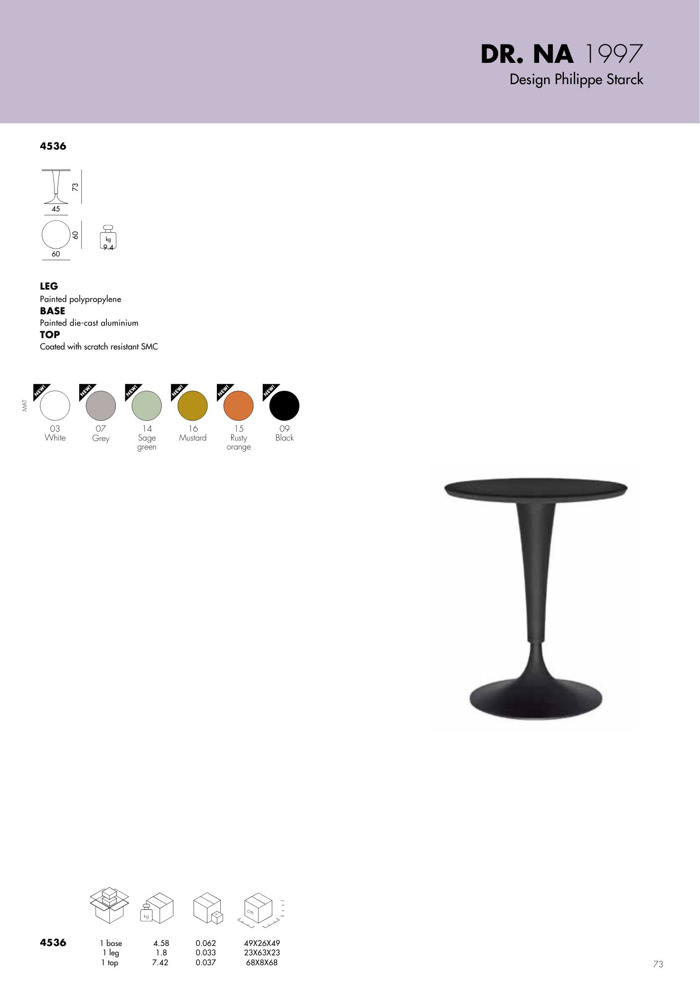 Με τη λουστραρισμένη και ανθεκτική στις εκδορές επιφάνεια και το κεντρικό πόδι, σε σχήμα αδραχτιού, από πλαστικό και αλουμίνιο, το Dr.Na μπορεί να τοποθετηθεί σε εξωτερικούς χώρους μαζί με τη μικρή πολυθρόνα δημιουργώντας