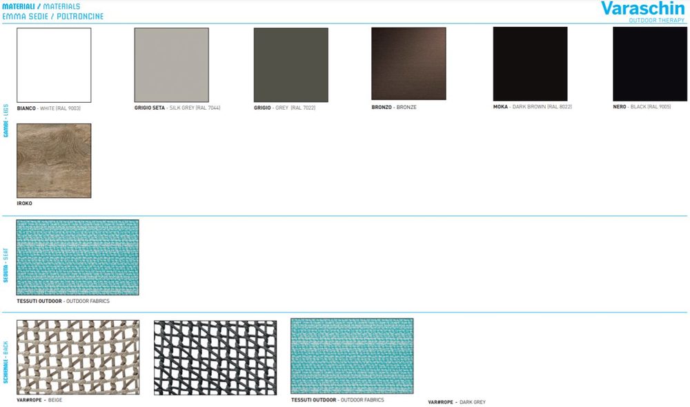 Η πλάτη του καθίσματος διατίθεται σε μπεζ και σκούρο γκρι χρώματα. προσαρμόσιμα πόδια σε αλουμίνιο σε λευκό, γκρι μεταξιού, γκρι, χάλκινο, moka και μαύρο ή σε ξύλο iroko κατάλληλο για εξωτερική χρήση. Ταπετσαρία διατίθεται σε διάφορες κατηγορίες υφασμάτων εξωτερικού χώρου Varaschin.