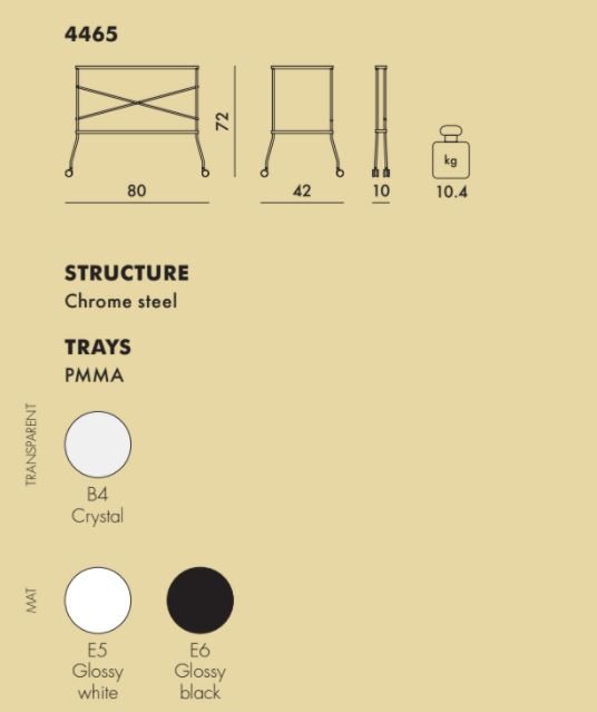 Πτυσσόμενο τρόλεϊ που αποτελεί πλέον τμήμα της συλλογής Kartell.Εντυπωσιακό και πολυλειτουργικό, το Flip είναι ένας συνδυσμός μεταξύ πλαστικού των ραφιών και μετάλλου της δομής.Τα ράφια μπορεί να έχουν χρώμα και να είναι αδιαφανή ή διάφανα, απο PMMA , με φακοειδές καλούπι,εξωτερική λειτουργικότητα και αισθητική.Μπορεί να χρξσιμοποιηθεί ως τρόλεϊ, ιδανικό για απεριτίφ και μπουφέ, αλλά και πρακτικό και ευπροσάρμοστο τραπεζάκι μπροστά απο καναπέ, μια και τα ράφια είναι ανεξάρτητα μεταξύ τους.Το Flip κλείνει και καταλαμβάνει ελάχιστο χώρο εκεί που τοποθετείται με μεγάλη ευκολία .