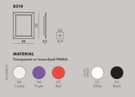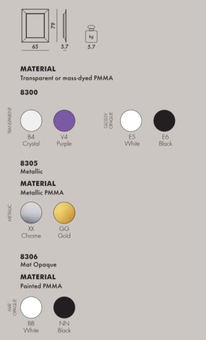 Μια σειρά από επίτοιχους καθρέφτες σε δυο μεγέθη, σε σχήμα παραλληλόγραμμο, με πλαίσια που θυμίζουν κονιορτοποιημένο κρύσταλλο. Τα πλαίσια κατασκευάζονται από διάφανο ή χρωματιστό πολυανθρακικό με τμήματα σαν τα φτερά του γλάρου. Μπορούν να κρεμαστούν οριζόντια ή κάθετα.