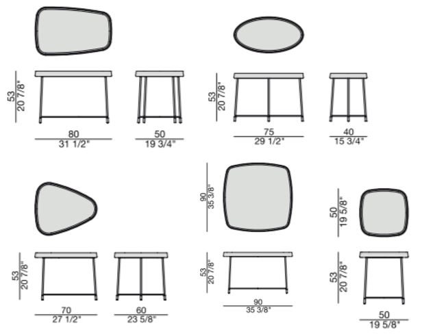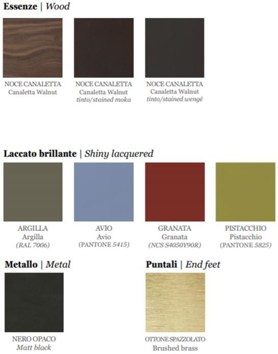Πλευρικά τραπέζια με βάση σε ματ μαύρο μέταλλο με βουρτσισμένα ορείχαλκο στα άκρα και κορυφή με σκελετό από συμπαγές καρύδι καναλέτας. Το εσωτερικό μέρος της κορυφής θα μπορούσε να είναι από ξύλο ή γυαλιστερή λάκα.