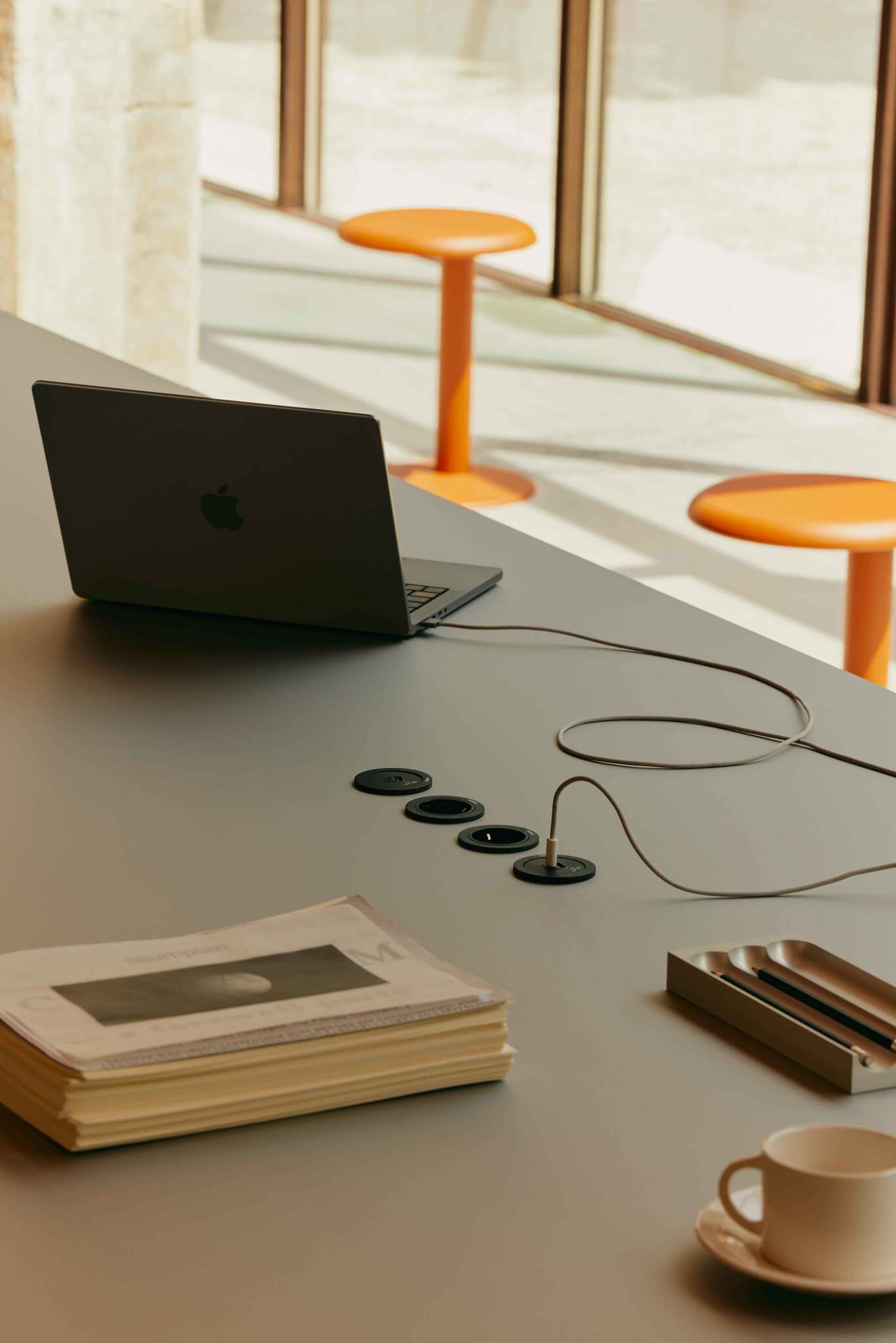 Στην έκδοση Office, το τραπέζι HEB εξελίσσει τη γλυπτική του φύση για να ανταποκριθεί στις ανάγκες της σύγχρονης εργασίας. Η επιφάνεια ενσωματώνει διακριτικά σετ πριζών που ενισχύουν τη λειτουργικότητά του, μετατρέποντάς το σε έναν εκλεπτυσμένο και ευέλικτο σταθμό εργασίας. Χωρίς να προδίδει την αισθητική του γλώσσα, το HEB προσαρμόζεται φυσικά σε επαγγελματικά περιβάλλοντα, διατηρώντας παράλληλα την εκφραστική του δύναμη. Ένα τραπέζι που συνδυάζει σχεδιασμό και τεχνολογία, συνοδεύοντας με κομψότητα τα νέα τελετουργικά της εργασίας.