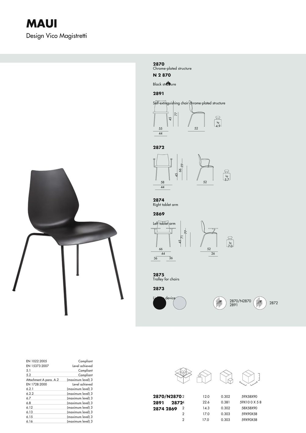 Έχει ενιαίο κάθισμα και πλάτη από πολυπροπυλένιο που στερεώνονται πάνω σε ένα σκελετό από επχρωμιωμένο χάλυβα. Χάρη στο σχεδιασμό τους, οι καρέκλες Maui στοιβάζονται μέχρι 5 ή 7 τεμάχια.