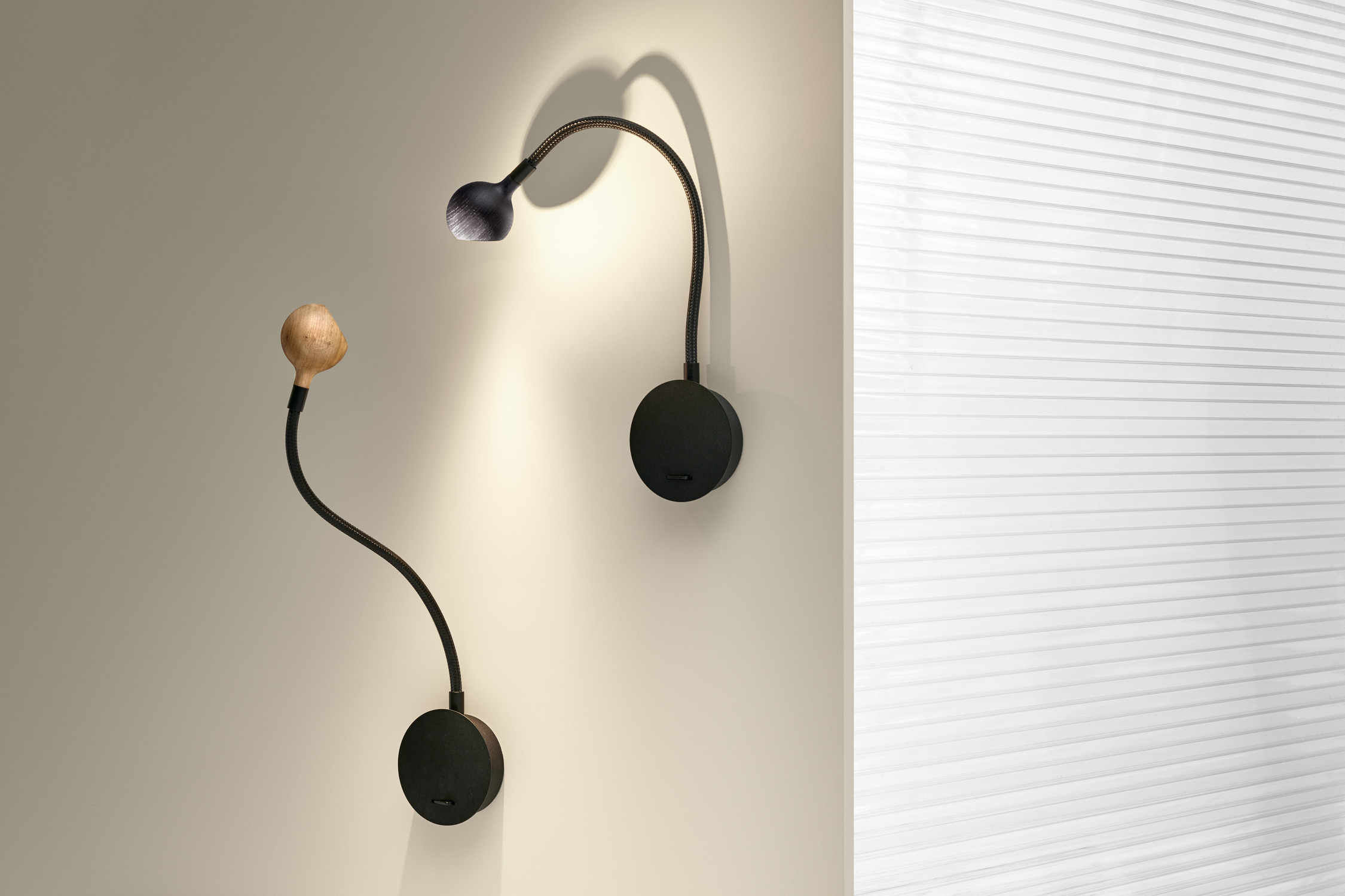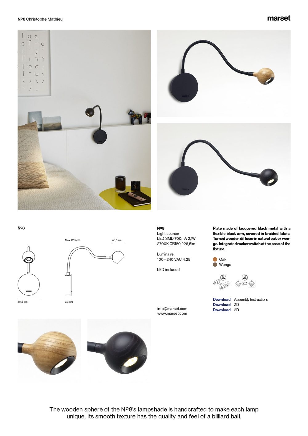 Η ξύλινη στρογγυλή σφαίρα του Nº8 είναι χειροποίητη για να κάνει κάθε κομμάτι μοναδικο. Η απαλή υφή του έχει την ποιότητα και την αίσθηση μίας μπάλας μπιλιάρδου, ενώ ο εύκαμπτος βραχίονας, o οποίος είναι καλυμμένος με ύφασμα, είναι το βασικό του στήριγμα που βελτιώνει την εμφάνιση, χωρίς να χάνει απο την αποτελεσματικότητα του.