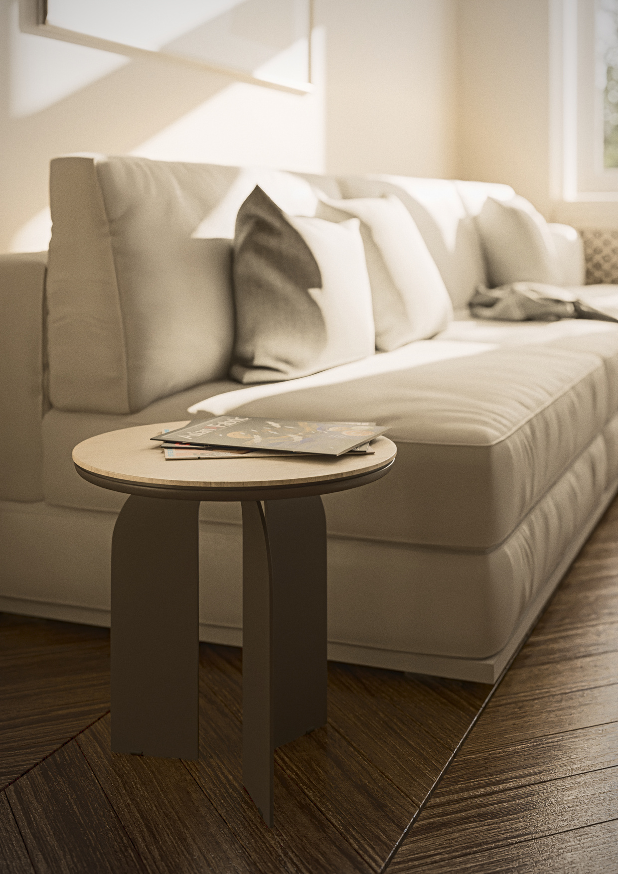 Διατίθεται σε διαφορετικές διαστάσεις και φινιρίσματα, επιτρέποντας ευέλικτες συνθέσεις είτε ως αυτόνομο κομμάτι είτε σε συνδυασμό με άλλα τραπεζάκια.