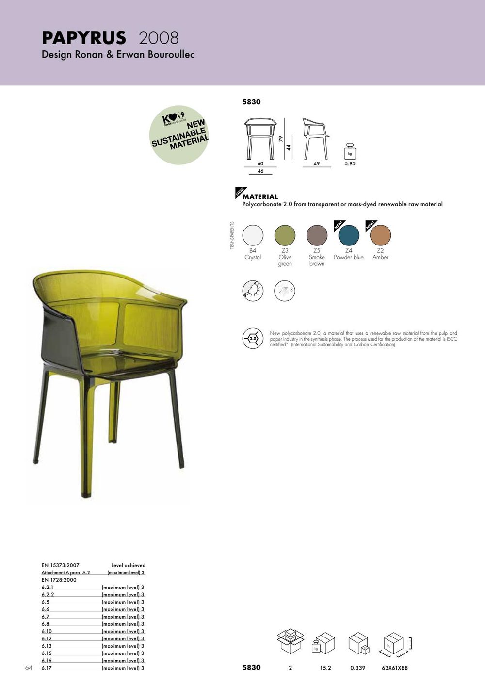 Το ζεύγος των σχεδιαστών, οι αδερφοί Bouroullec, με το εξαιρετικά ιδιαίτερο ύφος έχουν σχεδιάσει για την Kartell μια μικρή πολυθρόνα από διάφανο πολυανθρακικό, την Papyrus.