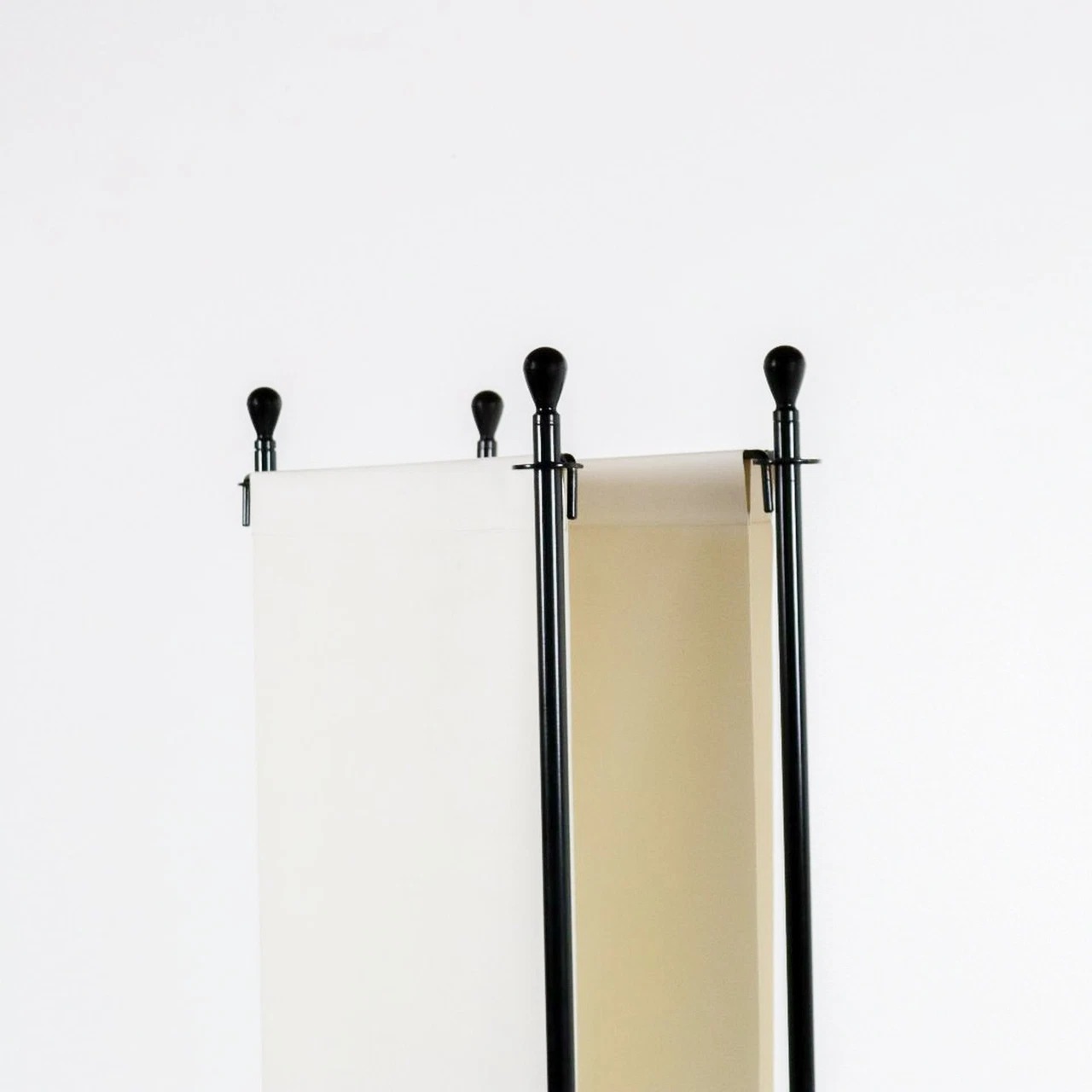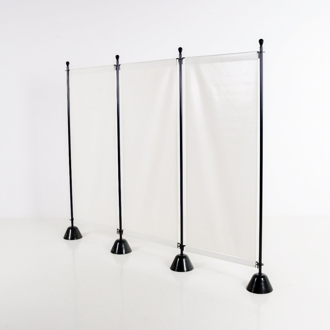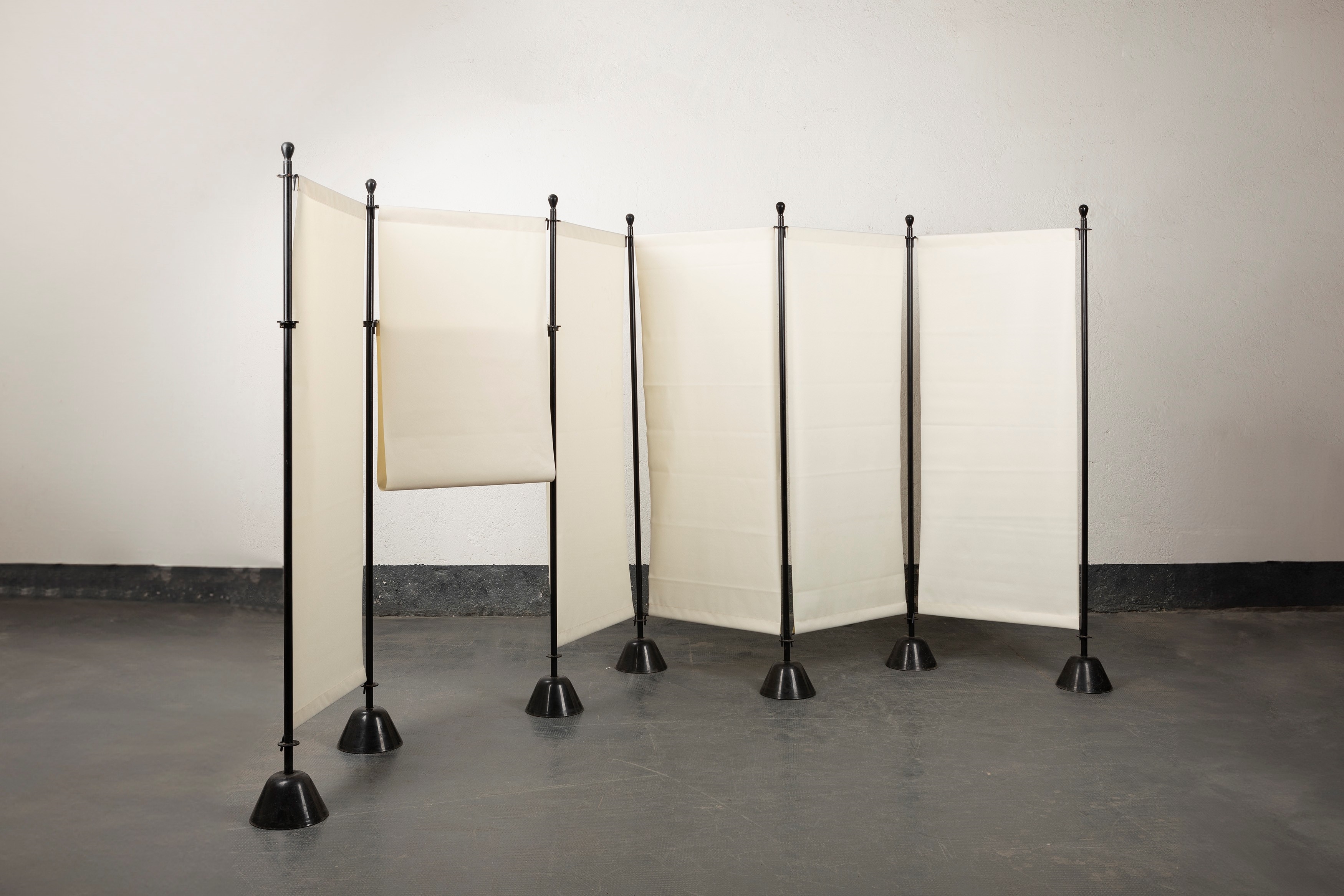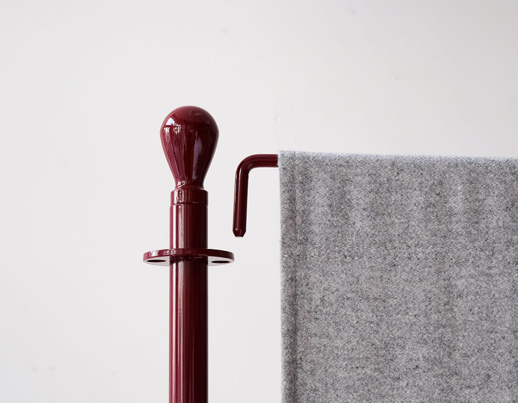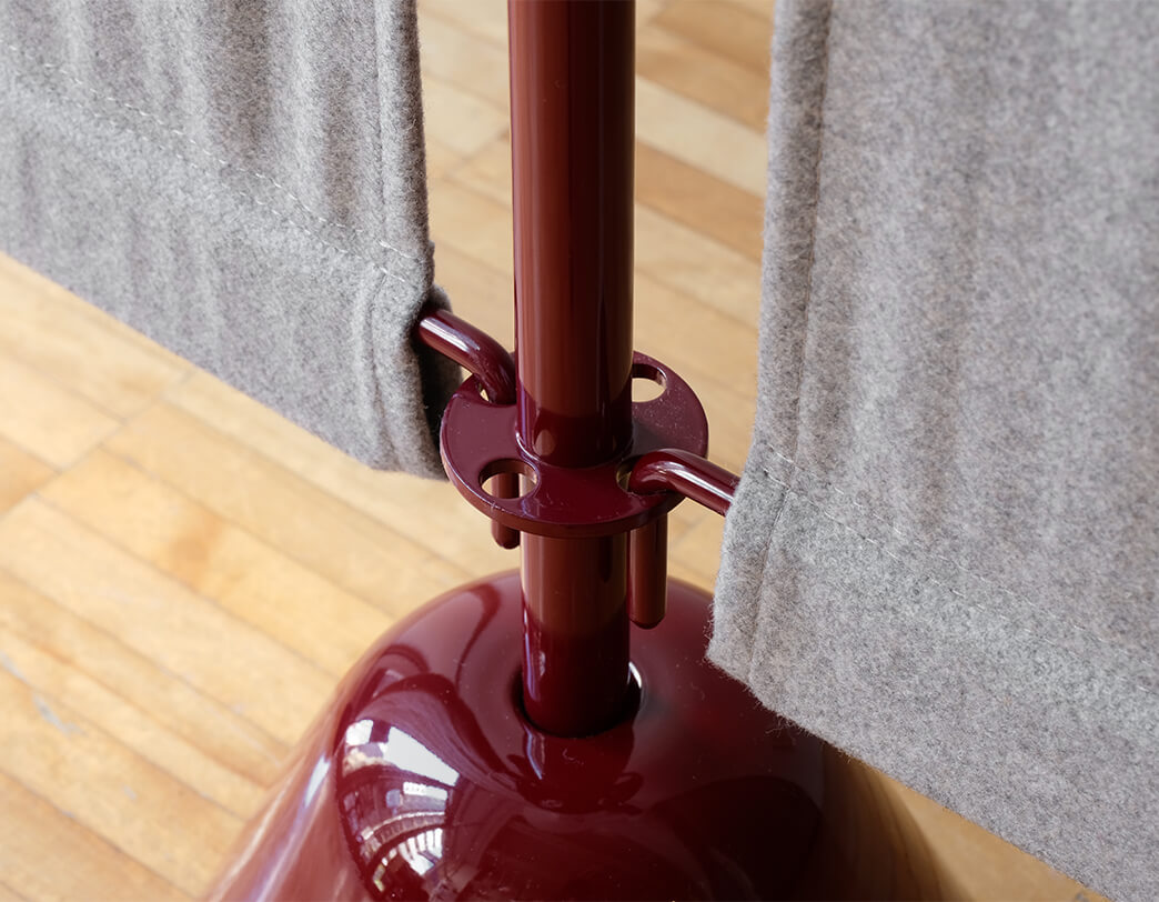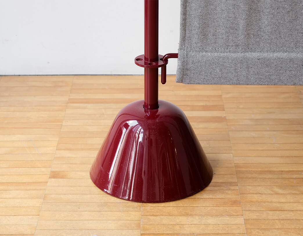Οθόνη. Βάση από ταλκ, αμάραντο ή μαύρο βαμμένο πολυπροπυλένιο. Ατσάλινη ράβδος στήριξης, βαμμένη σε ταλκ, αμάραντο ή μαύρο. Σίτα από μάλλινο καμβά, μεγέθη cm 66 x 150, στις αποχρώσεις: ανοιχτό γκρι, μεσαίο γκρι, σκούρο γκρι, κόκκινο, κίτρινο, μπλε της πούδρας, τούβλο, ανοιχτό πράσινο, σκούρο πράσινο ή μοβ.