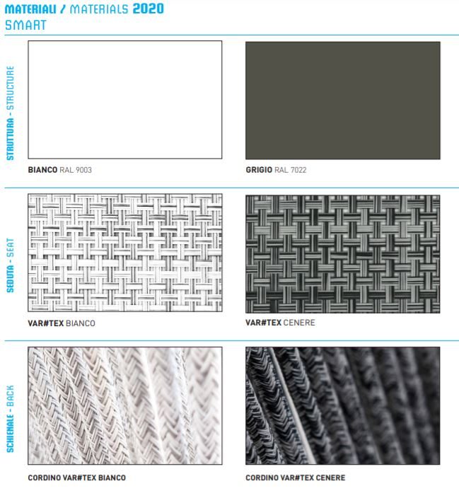 Δομή διαθέσιμη σε λευκό ή γκρι, κάθισμα σε VAR # TEX λευκό ή κερί και πλάτη πλάτης σε VAR # TEX λευκό ή κερί. Ταπετσαρία διατίθεται στις διάφορες κατηγορίες υφασμάτων εξωτερικού χώρου Varaschin.