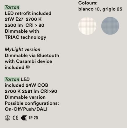 Το κρεμαστό φως Tartan σχεδιάστηκε από τους Ludovica και Roberto Palomba το 2015, οι οποίοι χρησιμοποιούν το μοτίβο ταρτάν, που συνήθως φαίνονται στα παραδοσιακά σκωτσέζικα κιλά, ως βάση του σχεδιασμού. Το μενταγιόν είναι φτιαγμένο από γυαλί μέσα σε ένα καλούπι που έχει χαραγμένο το σταυρό μοτίβο. Στη συνέχεια, η σκιά σχηματίζεται με το όμορφο σχέδιο ταρτάν και έχει μια μεταξένια, υφή εμφάνιση που προκαλεί την αίσθηση του υφάσματος. Διατίθεται σε 2 λεπτά χρώματα, λευκό ή γκρι. Το κρεμαστό φως εκπέμπει μια απαλή, διάχυτη λάμψη και το άνοιγμα στο κάτω μέρος επιτρέπει ένα προς τα κάτω κατευθυνόμενο φως που είναι ιδανικό για να κρέμεται πάνω από τραπέζια και επιφάνειες. Μην χάσετε αυτό το εντυπωσιακό και αξιοσημείωτο φως!