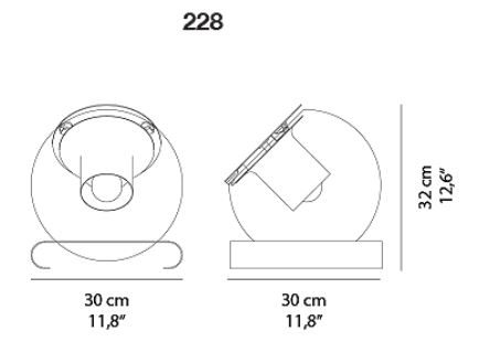 Οι καθαρές γεωμετρίες του συνυπάρχουν σε μια σταθερή ισορροπία μεταξύ σχήματος και λειτουργικότητας: η διαφανής σφαίρα από φυσητό γυαλί περιέχει τον κυλινδρικό μεταλλικό ανακλαστήρα που προβάλλει το διαχρονικό φως του στο διάστημα, διαθέσιμο σε σατέν νικέλιο ή σατέν χρυσό - ανοδικά φινιρίσματα μπρούτζου.