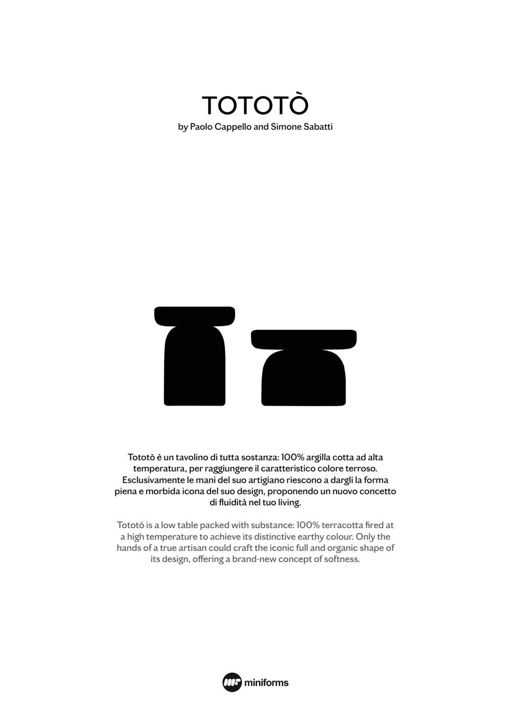 Το Tototò είναι ένα χαμηλό τραπέζι γεμάτο με ουσία: 100% τερακότα υψηλής θερμοκρασίας για να επιτύχει το χαρακτηριστικό γήινο χρώμα του. Μόνο τα χέρια του τεχνίτη του καταφέρνουν να του δώσουν το εμβληματικό πλήρες και απαλό σχήμα του σχεδιασμού του, προσφέροντας στον χώρο σας μια νέα έννοια ρευστότητας.