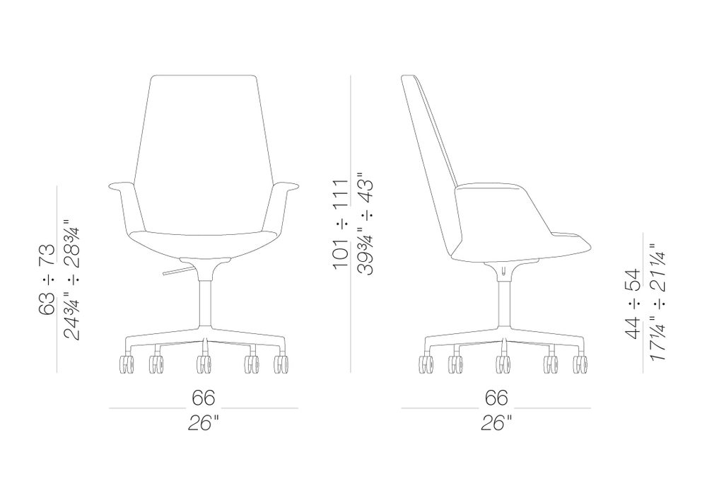 Οικογένεια καθισμάτων με ρυθμιζόμενη ή σταθερή βάση σε χυτοπρεσαριστό αλουμίνιο, με επίστρωση Η/Σ βαφής πούδρας. Εκδοχές με ρόδες και μηχανισμό κλίσης. Το κάθισμα και η πλάτη σε διάφορα ύψη είναι φτιαγμένα από αφρό πολυουρεθάνης επικαλυμμένο με ύφασμα, δέρμα ή οικολογικό δέρμα. Ο μηχανισμός κλίσης προτείνεται ιδιαίτερα για χρήση σε σαλόνι.