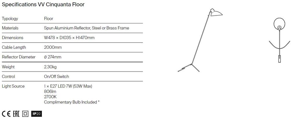 Το VV Cinquanta διαθέτει μια κομψή και ευέλικτη πηγή άμεσου φωτός που μπορεί να περιστρέφεται και να γέρνει, από το άμεσο φως εργασίας έως τον φωτισμό προς τα πάνω.