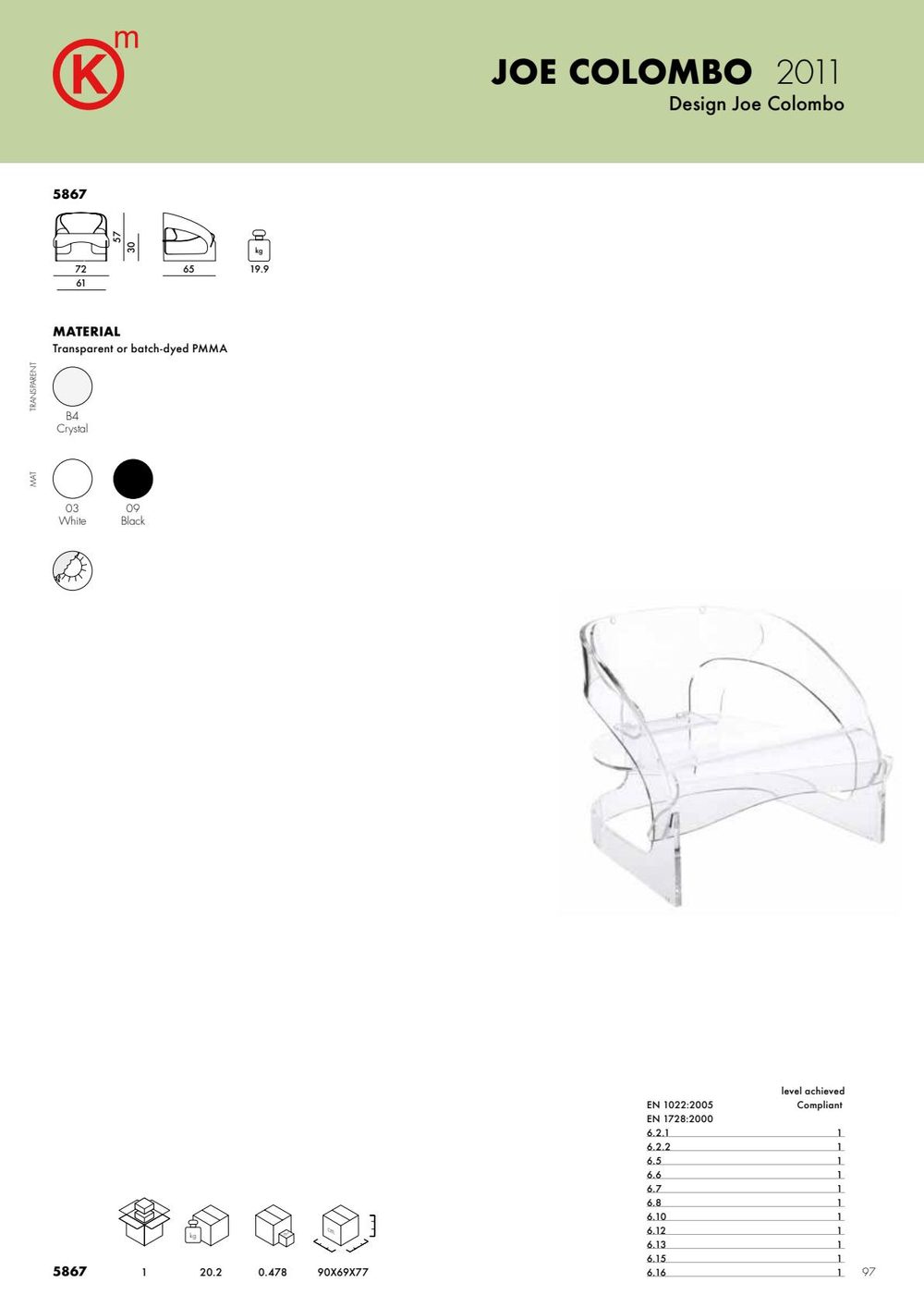 Για πρώτη φορά η Kartell αποτείνει φόρο τιμής σε ένα απο τα κομμάτια του μουσείου της και επανεκδίδει την πολυθρόνα 4801 σε σχεδιασμό Joe Colombo, αυθεντικό σύμβολο του στυλ της δεκαετίας του 60,πολύ δημοφιλής στις δημοπρασίες σύγχρονων καλλιτεχνημάτων.Διάσημη και για το γεγονός οτι είναι το μοναδικό κομμάτι της Kartell αποκλειστικά απο ξύλο.Η σύγχρονη τεχνολογία επιτρέπει σήμερα τη δημιουργία του ίδιου προϊόντος χρησιμοποιώντας το PMMA,αξιοποιώντας μια βιομηχανική παραγωγή έγχυσης για το καμπυλωτό και χυτό καλούπι.Κάθισμα σε αριθμημένα κομμάτια ,διαθέσιμο σε τρία χρώματα -διάφανο, λευκο και μαύρο-που αναδεικνύουν τις φόρμες.
