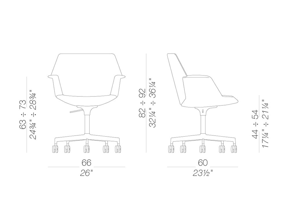 Οικογένεια καθισμάτων με ρυθμιζόμενη ή σταθερή βάση σε χυτοπρεσαριστό αλουμίνιο, με επίστρωση Η/Σ βαφής πούδρας. Εκδοχές με ρόδες και μηχανισμό κλίσης. Το κάθισμα και η πλάτη σε διάφορα ύψη είναι φτιαγμένα από αφρό πολυουρεθάνης επικαλυμμένο με ύφασμα, δέρμα ή οικολογικό δέρμα. Ο μηχανισμός κλίσης προτείνεται ιδιαίτερα για χρήση σε σαλόνι.