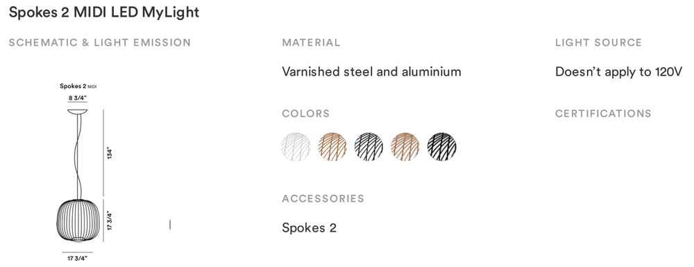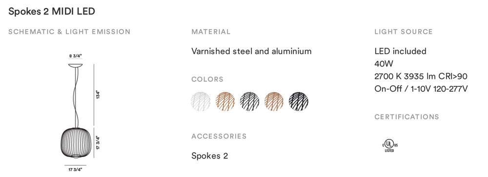 Το μενταγιόν Spokes 2 είναι ένα σύγχρονο και κομψό φως που παίρνει το όνομά του από τις ακτίνες σε έναν τροχό ποδηλάτου λόγω του σχεδιασμού της μεταλλικής ράβδου. Το φως είναι φτιαγμένο σε ένα υπέροχο στρογγυλό σχήμα που είναι ελκυστικό και φιλόξενο, κατάλληλο για πολλά δωμάτια τόσο σε σπίτια όσο και σε χώρους εργασίας. Το κρεμαστό φως Spokes 2 διαθέτει 2 ενσωματωμένες πηγές φωτισμού LED με μία στραμμένη προς τα πάνω και μία στραμμένη προς τα κάτω. Αυτό επιτρέπει ένα λειτουργικό κάτω φως που θα φαίνεται καλό κρεμασμένο πάνω από τα τραπέζια και το πάνω φως αντανακλά μέσα από τις ράβδους, δημιουργώντας παιχνιδιάρικες σκιές που είναι διακοσμητικές. Διαθέσιμο σε 3 μεγέθη και 5 χρώματα, αυτό το φως είναι πραγματικά καινοτόμο καθώς μπορεί να μειωθεί μέσω Bluetooth χρησιμοποιώντας την εφαρμογή Casambi σε οποιαδήποτε έξυπνη συσκευή!