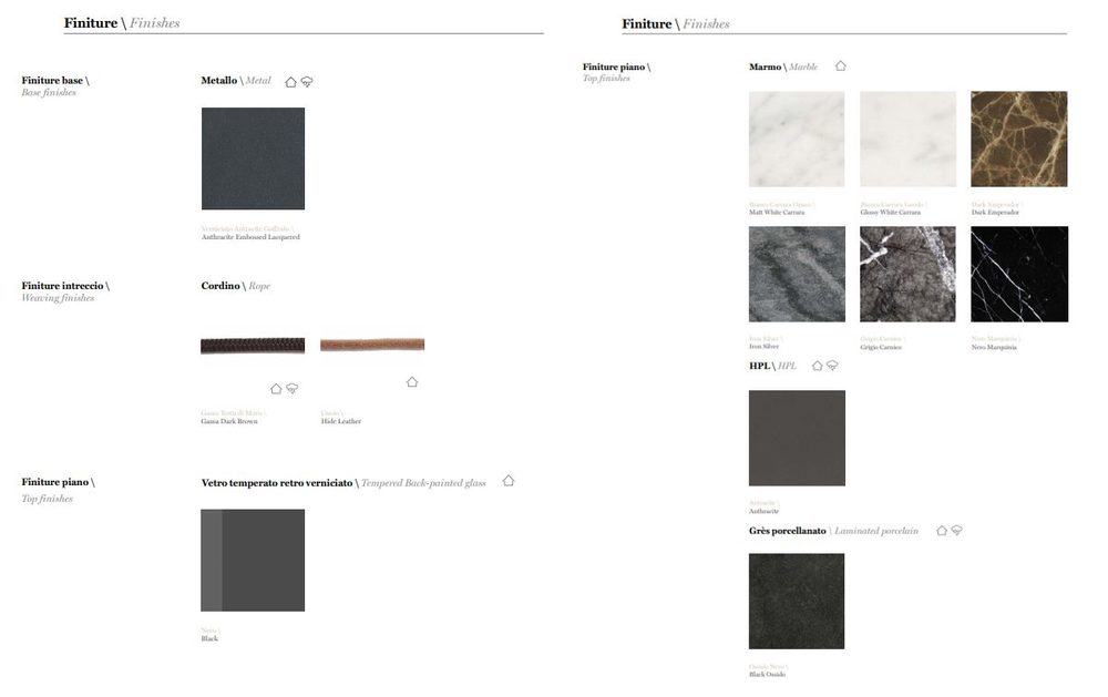 Από τις εξωτικές αναμνήσεις, το Ropu ξεχωρίζει για το εκλεπτυσμένο υφαντό περίγραμμά του σε σκοινί από δέρμα, που τρέχει κατά μήκος της περιμετρικής δομής δημιουργώντας ένα πλαίσιο για μάρμαρο, γυαλί με βαμμένο πίσω μέρος, πλαστικοποιημένες πορσελάνες και κορυφές HPL ή μαλακά μαξιλάρια με προφίλ κορδονιού ποντικιού.