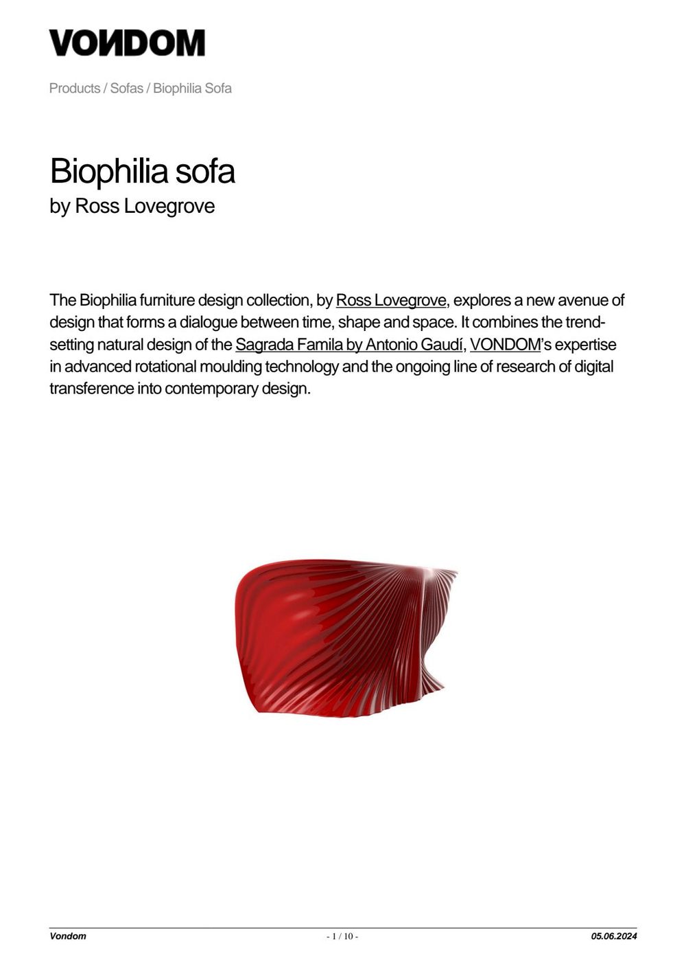 Biophilia is a polyethylene sofa. A new furniture collection by Ross Lovegrove for VONDOM. BIOPHILIA Collection explores a new design language that forms a dialogue between time, form and space combining the pioneering organic design of Sagrada Famila by Antonio Gaudi, VONDOM expertise in advanced roto-moulded technology.