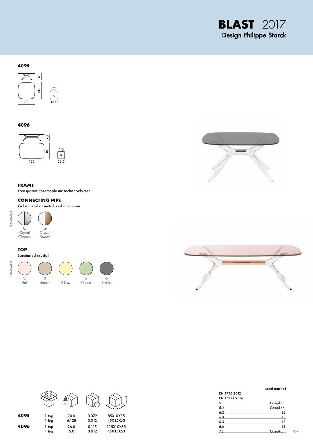 The Blast line is composed of two different-shaped side tables (oval and square ) with transparent bases and tops. The design is an evolution of the Sir Gio table, meaning that different-coloured bases and tabletops can be put to- gether. The centre of the base can be metallic chrome or copper.