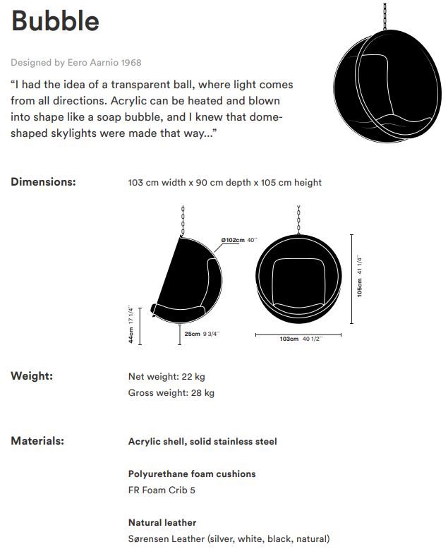 The Bubble Chair by Adelta is one of the most remarkable icons of the century. Like the Ball Chair the Bubble Chair also impresses the user by the special acoustic. The Bubble Chair swallows the sounds and you feel isolated inside in a pleasant way, even when you are in a crowded place. Designed by Eero Aarnio, 1968