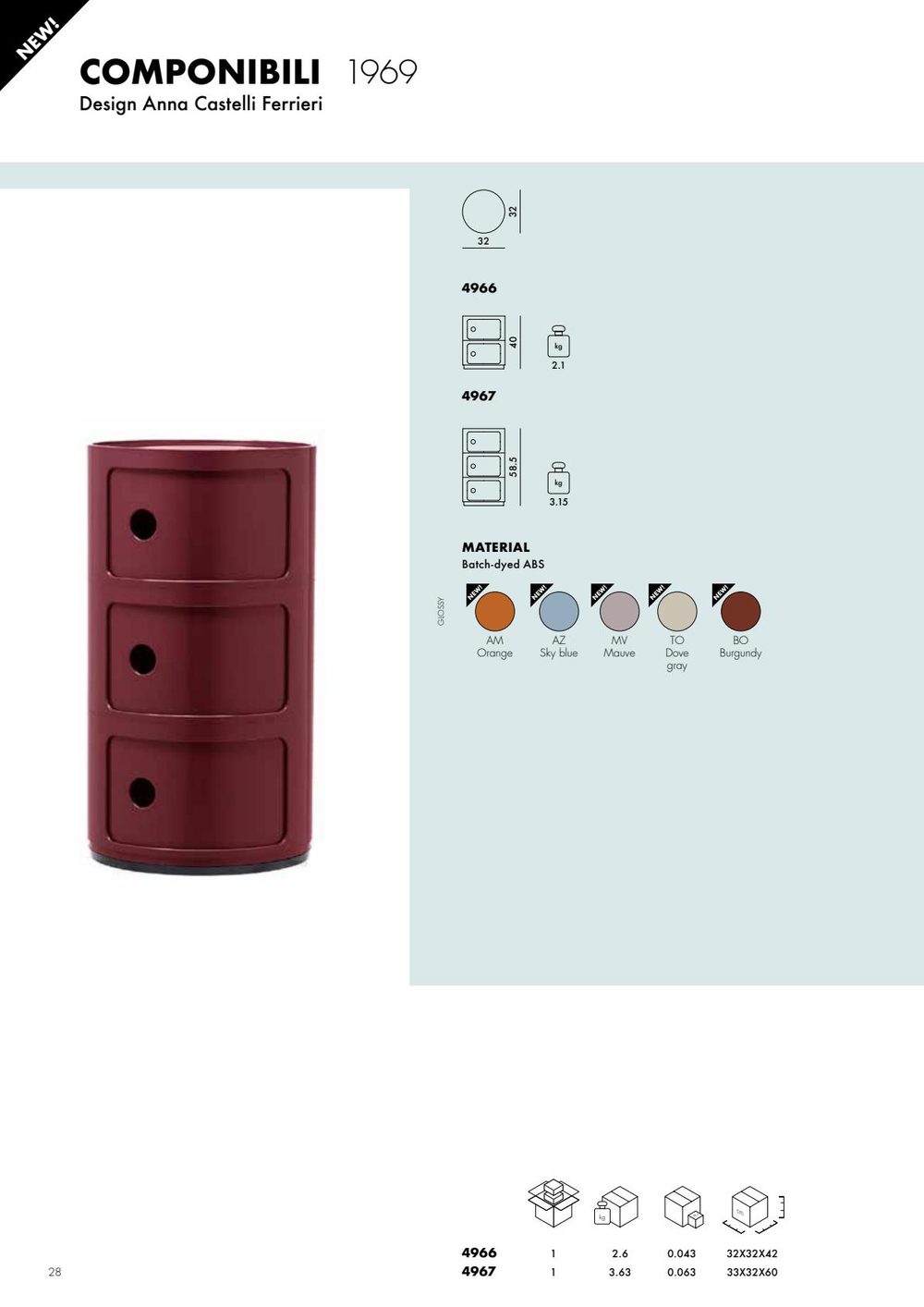 The modular elements were designed to meet different needs and to fit perfectly into every room in the home. Componibili first appeared in 1967 and have become a timeless furnishing classic. Today’s Componibili are 32 cm in diameter. Thanks to fixed compositions of two, three or four elements, these products are both functional and practical in all environments. This model comes in six glossy finishes and one matte silver finish.
