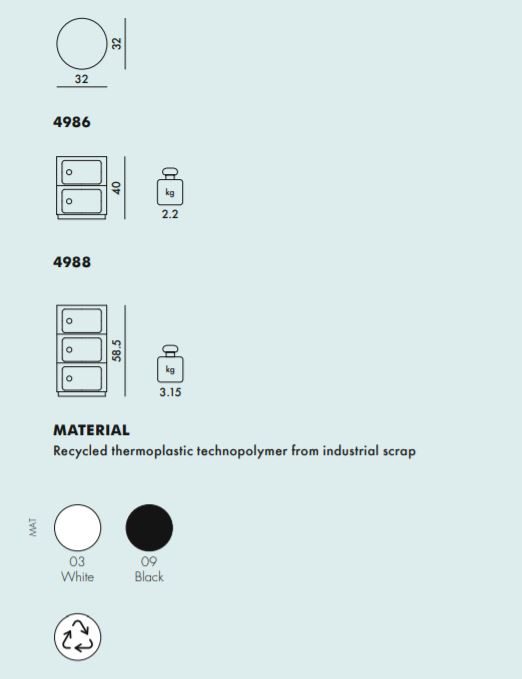 The Componibile, one of the brand’s greatest best-sellers, is available in matt black and white, in an additional variant of one of Kartell’s most famous and instantly recognisable products, featured in homes all over the world for more than 50 years. A highly functional product in a modern, trend-setting finish. The new edition is made of recycled industrial materials, and has the same robust construction and functionality as the original. Available with fixed, non-stackable, two or three element structures of 32 cm in diameter. Soft touch effect mat finish.