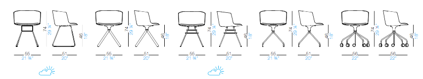 5 different bases are available ; wood, sled, eiffel, with 4 spokes, or on wheels. The armchair is coated with a fabric, and is available in 2 different colors.