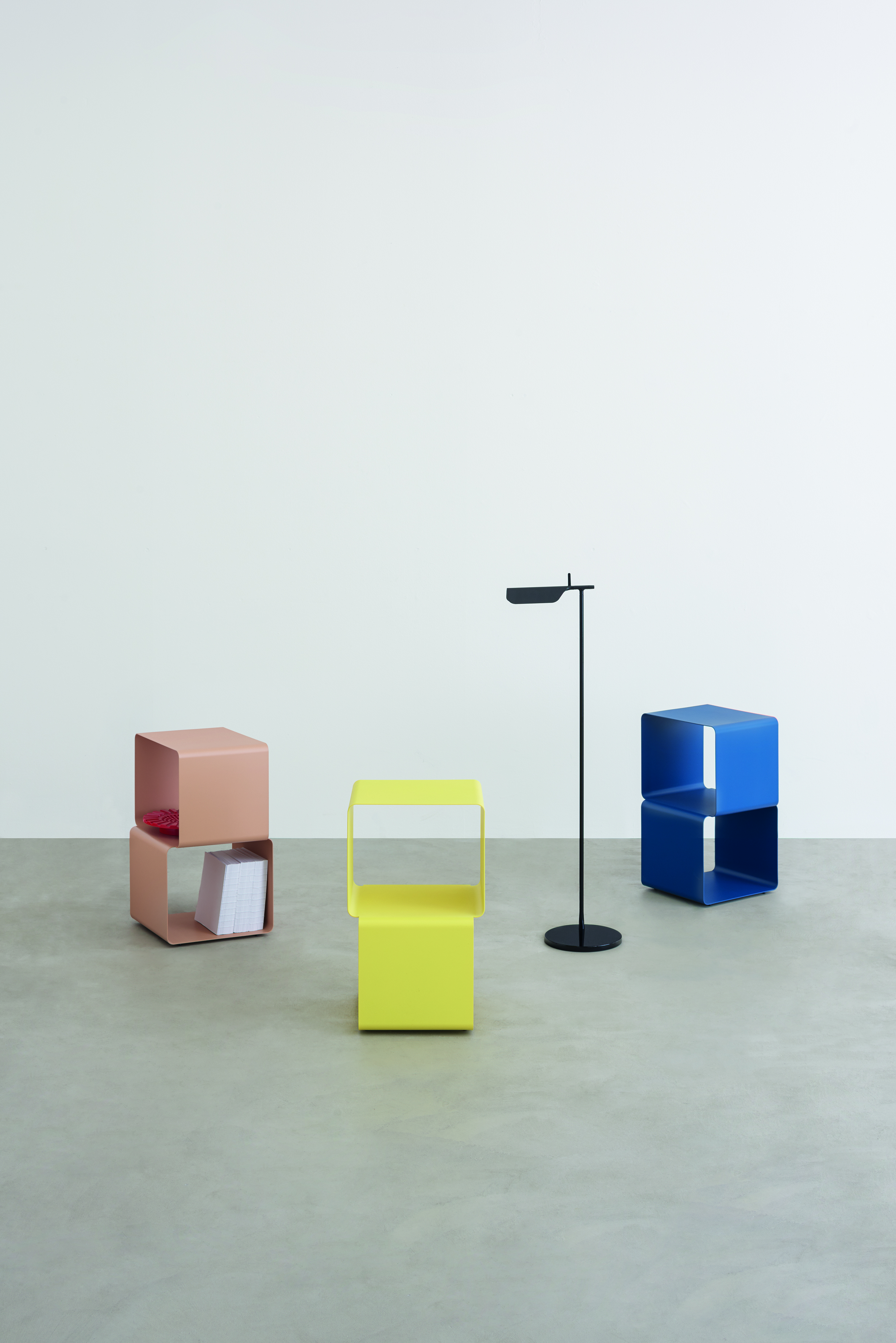 Small and practical side table with a structure made of curved steel sheet, resembling the shape of two stacked cubes. This design not only provides a functional solution for storing items but also adds a touch of modernity and style to the surrounding space. Its compact geometric shape makes it ideal for use in small environments.