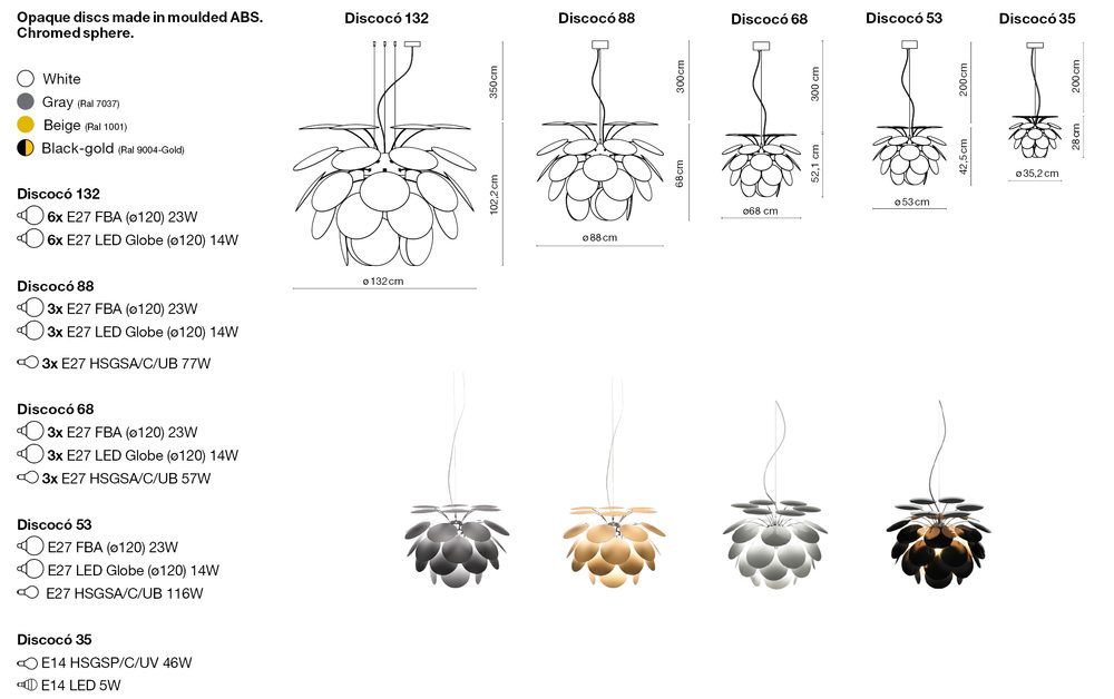 Exuberant even when turned off, the richness of the light issuing from the Discocó lamp provides direct downward illumination along with a dramatic play of lights and soft shadows.