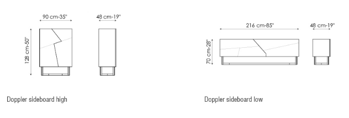 The Doppler K Sideboards supplement the Doppler Sideboard collection designed by Giuseppe Viganò for Bonaldo. They propose the same asymmetrical opening of the doors, but they are made of ceramic. The frame is in white or black lacquered wood and in supported by a metal base.