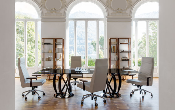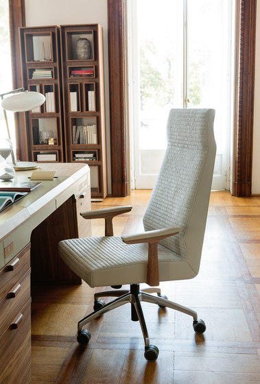 The captivating elegance of the office chairs Elis wins over everyone’s heart. Home office design is often characterised by warm working home spaces, where natural materials enrich the products functionality and where sophisticated shapes and a high level of comfort characterise each product. Elis is an executive chair with castors and adjustable height, perfect as a home office desk chair, or for a proper executive office, behind a directional desk.