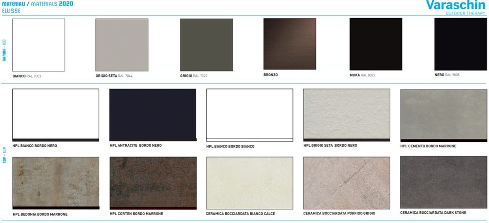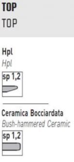 Structure with frame and legs available in white, grey, silk grey, bronze, moka and black. Legs available also in solid teak wood.HPL top in white, antracite, silk grey, cemento, bedonia, corten or bush-hammered ceramic in lime white, grey porphyry, dark stone.