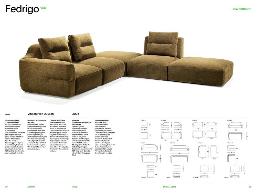 Plywood frame. Armrest, backrest and seat padding in Circullarrefoam ® polyurethane, made with a percentage of recycled polyols. Upholstery in graduated density/recycled PET fibre. Parts assembly without glues that can be completely disassembled. Back cushion in recycled PET fibre and fabric. Fabric removable cover.