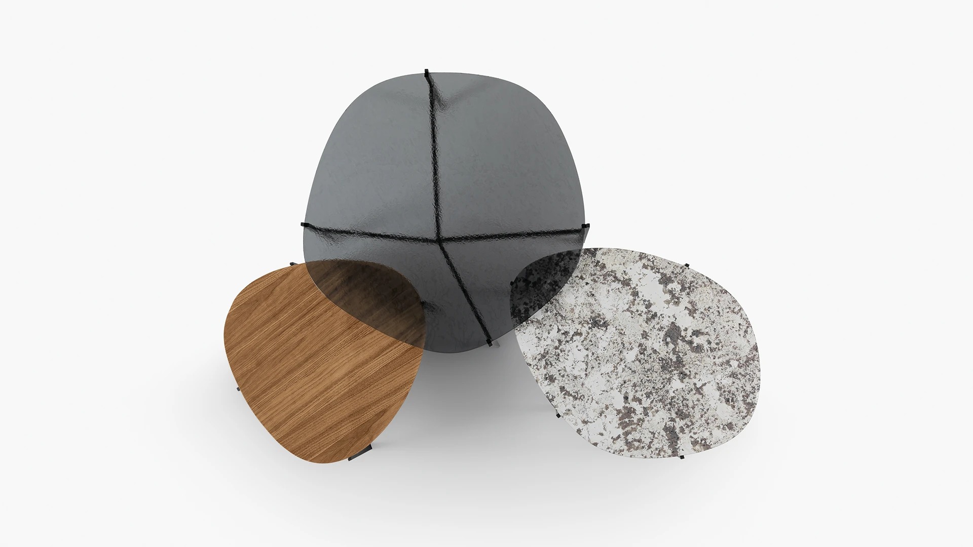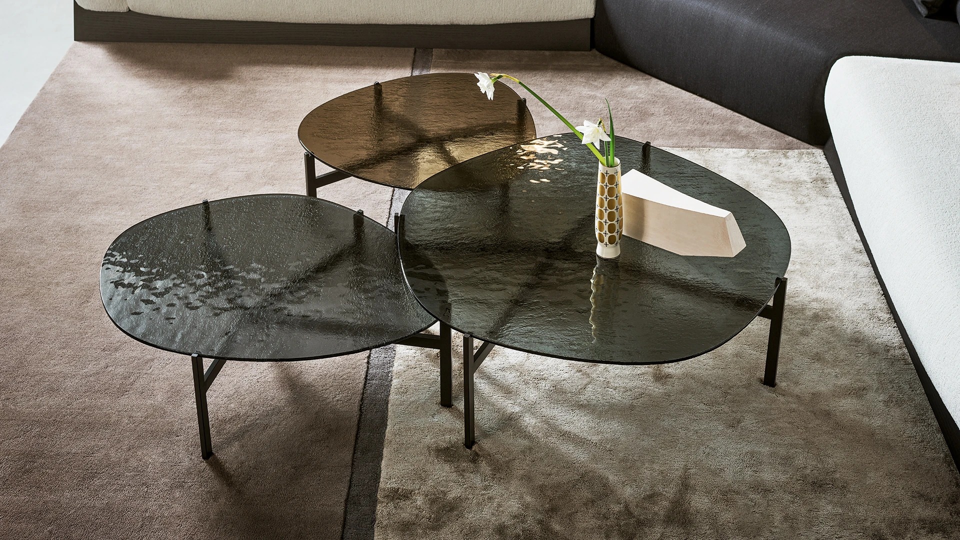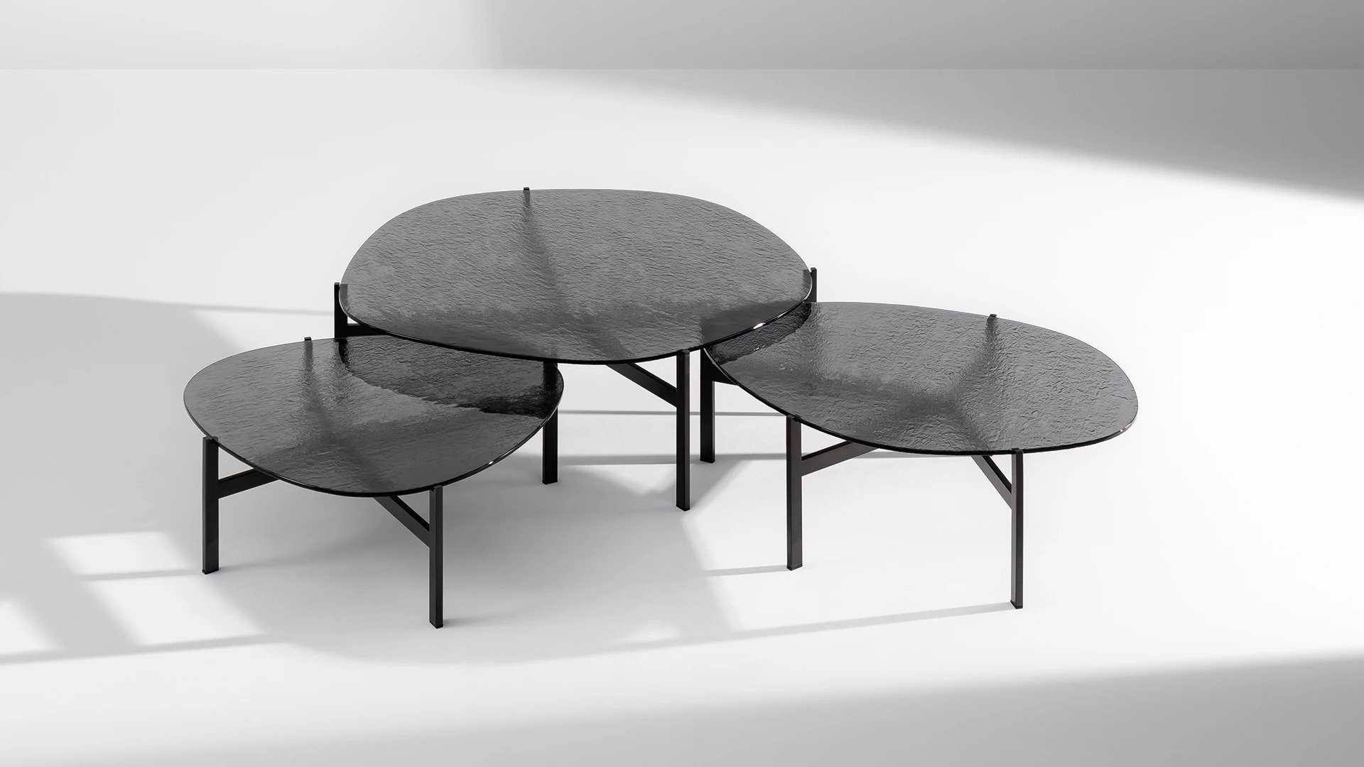 The different heights at which the tables are offered allow the creation of interesting compositions, characterized by a subtle interplay of superimpositions which highlight different shades of colour in the intersection of the glass.