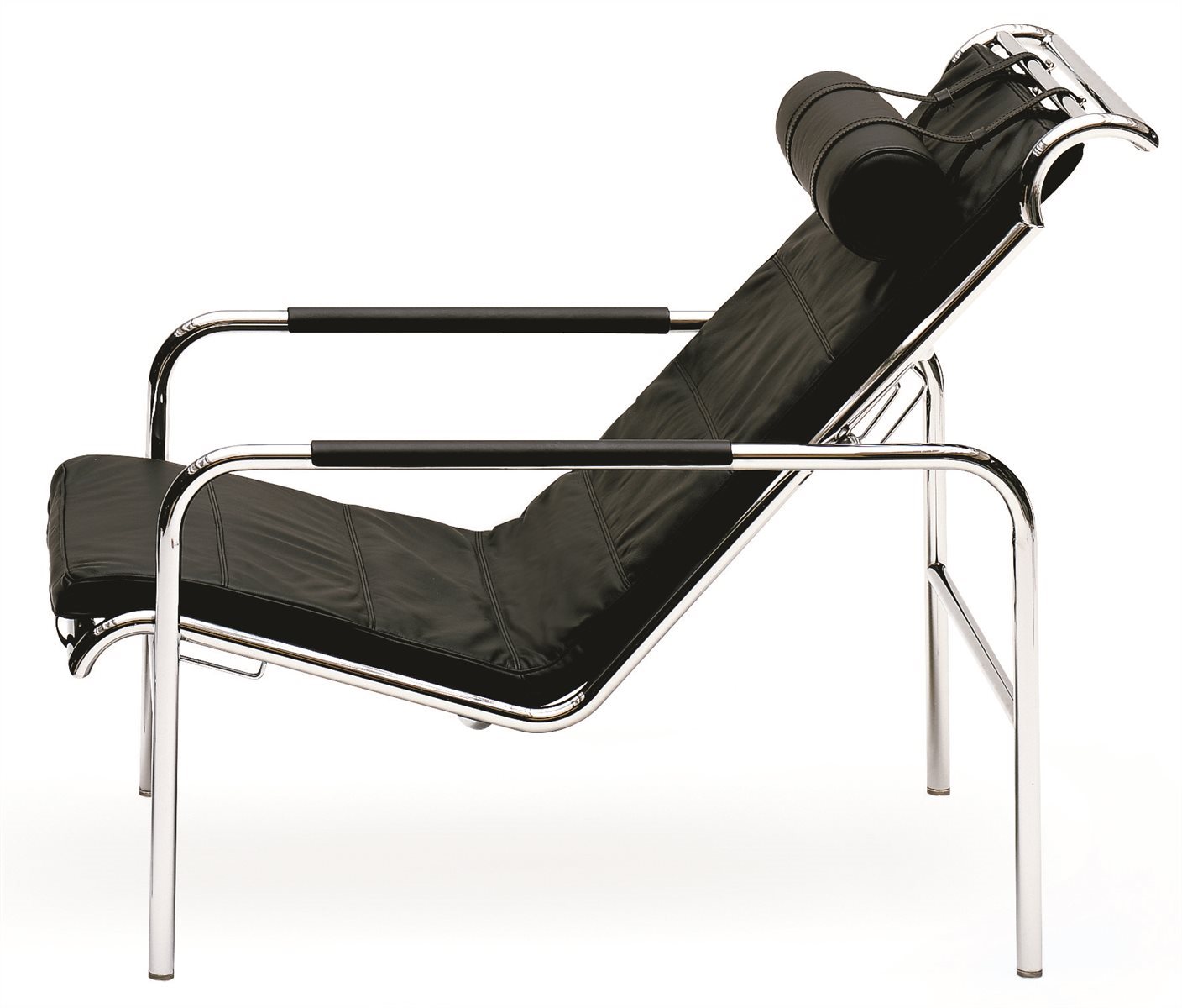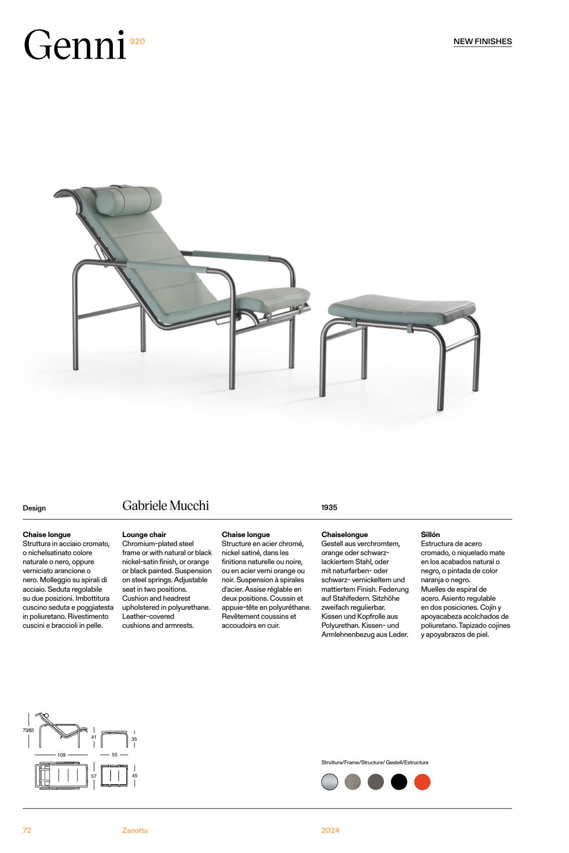 Chromium-plated steel frame or with natural or black nickel-satin finish, or orange or black painted. Suspension on steel springs. Adjustable seat in two positions. Cushion and headrest upholstered in polyurethane. Leather-covered cushions and armrests.