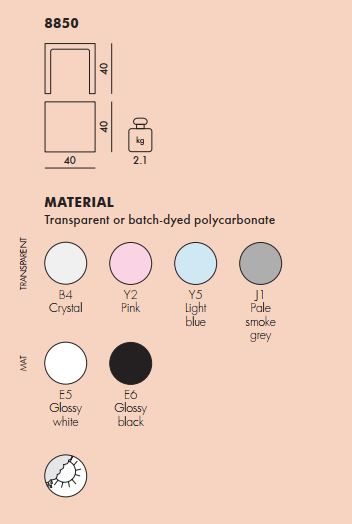 A small, fully transparent table of compact and perfect dimensions: 40 x 40 x 40 cm. Crystal-clear, colourful, elegant and trendy, it is at the same time practical, durable, secure and functional. Jolly is a versatile, elegant and cheerful side-table made of a single moulded sheet of transparent PMMA and it is also available in spring shades. '
