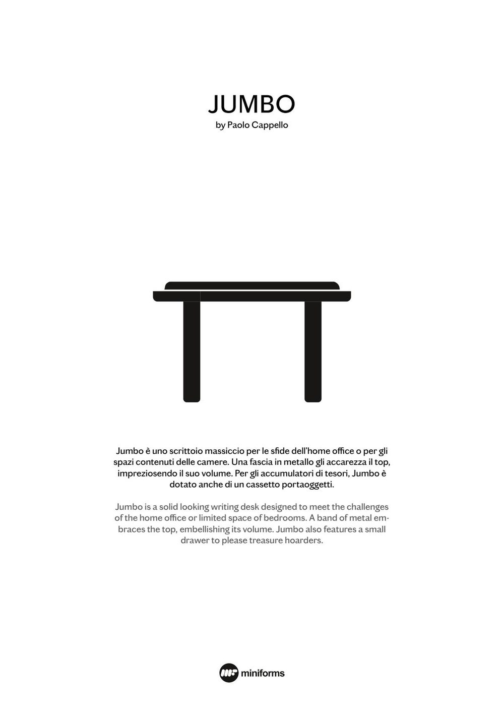 Jumbo is a solid looking writing desk designed to meet the challenges of the home office or limited space of bedrooms. A band of metal embraces the top, embellishing its volume. Jumbo also features a small drawer to please treasure hoarders.