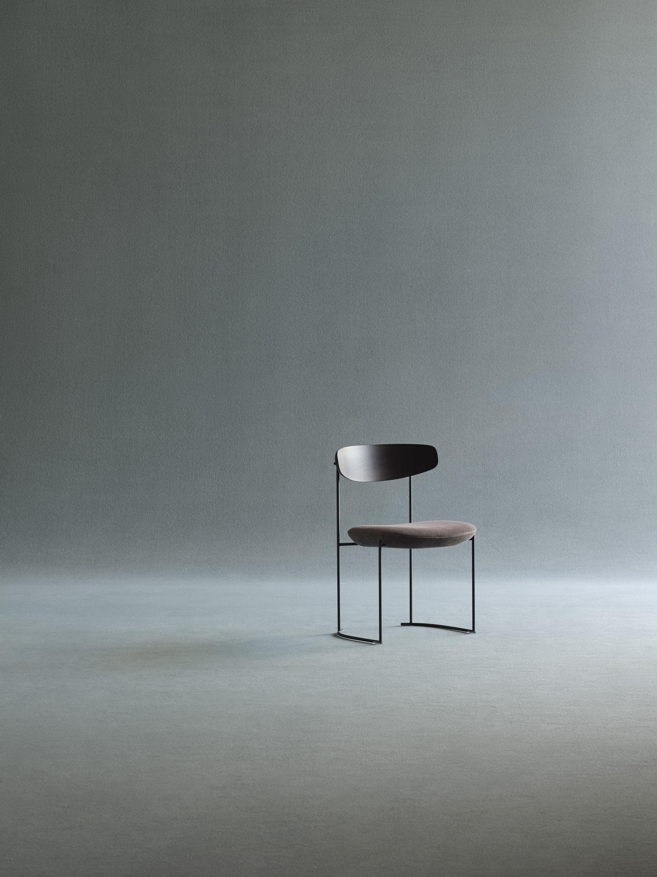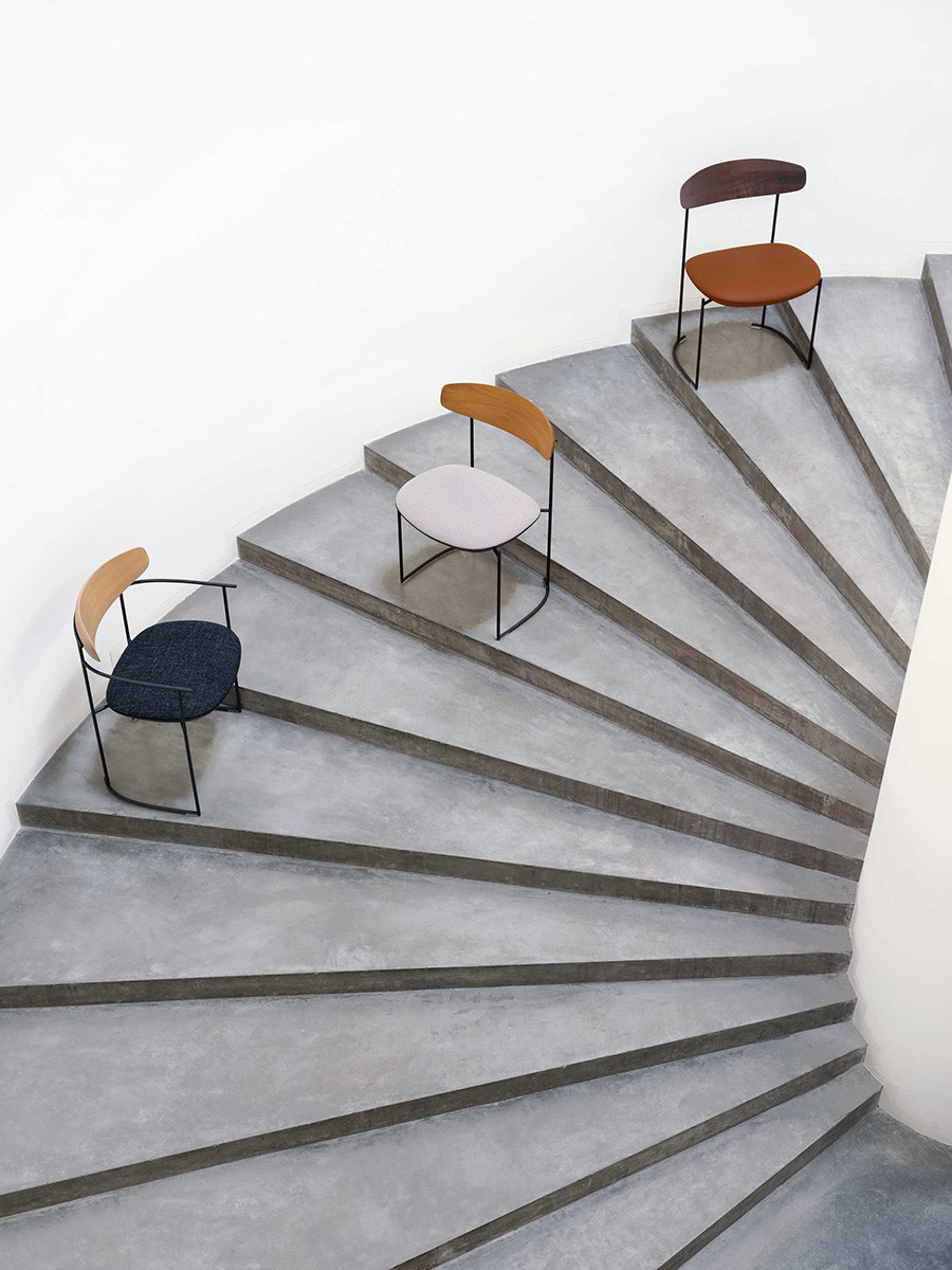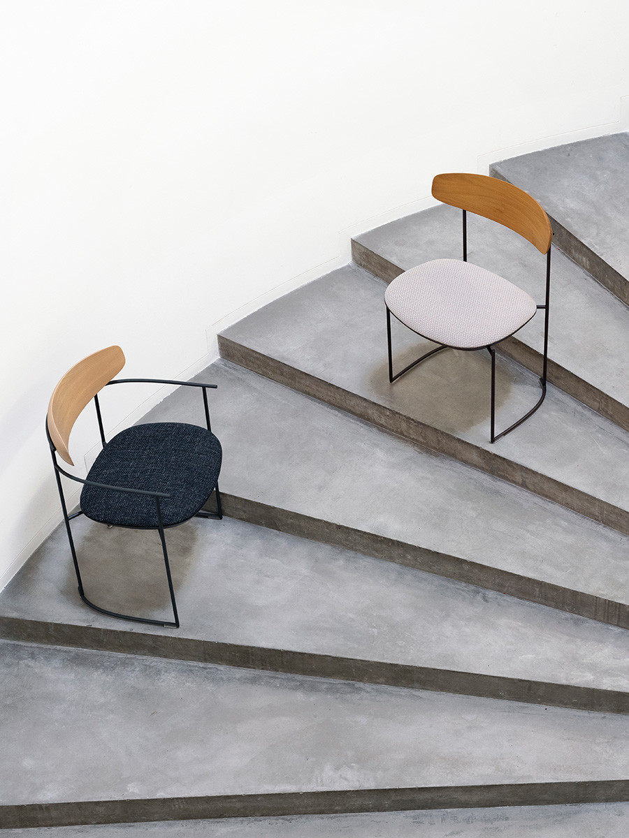 Keel chair and small armchair were born from the research between geometric rigor and organic sinuosity.